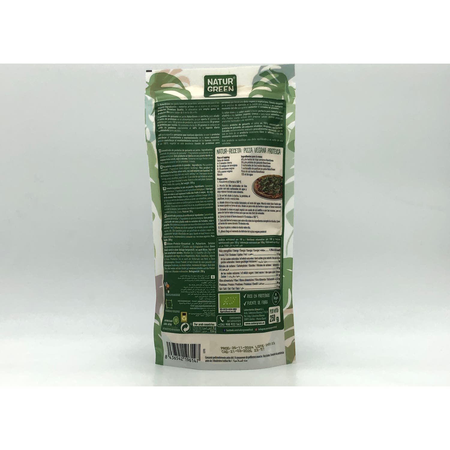 Proteína Naturgreen a base de concentrado de guisante. Contiene 250gr de producto en el paquete. Se trata de un complemento proteico que aporta una serie de aminoácidos que contribuyen al correcto funcionamiento del organismo. Libre de gluten y sin azúcares añadidos. Aporta el 40 % de la ingesta de proteínas diarias para un adulto. Posee elementos necesarios para aumentar el sistema inmunológico y la absorción de vitaminas. Se recomienda su uso a personas con régimen dietético estricto. Empleo aconsejable para deportistas. Ideal para niños y jóvenes en crecimiento. No apto para el manejo de infantes. No se sugiere el uso de este producto a personas con alteraciones metabólicas severas. No utilizar como única fuente de proteínas. En caso de presentar reacciones adversas a las esperadas, visitar al médico o al nutricionista de confianza.
