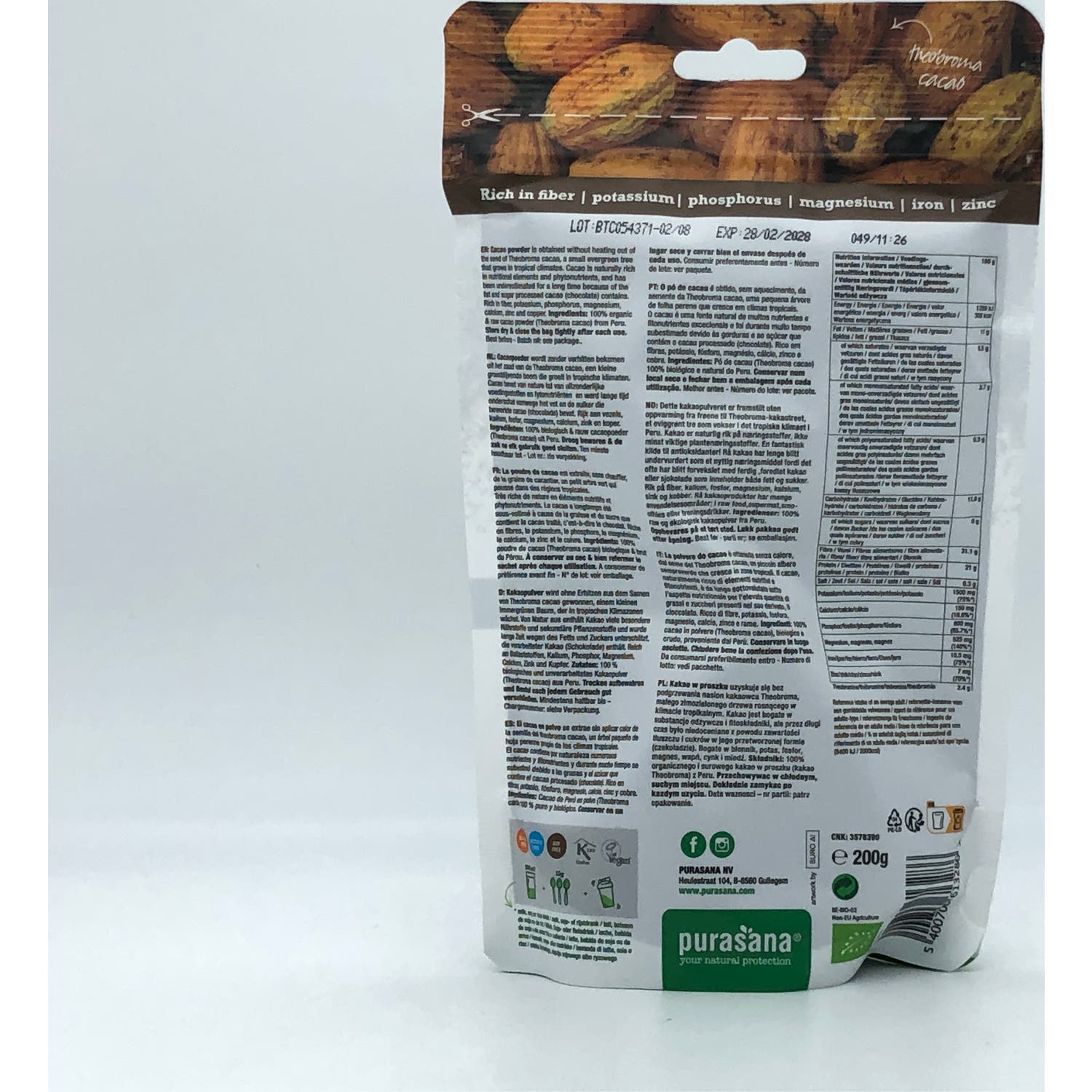 Purasana Cacao Puro en Polvo 200g es cacao en polvo que actúa como fuente de fibra que da soporte a la función intestinal.