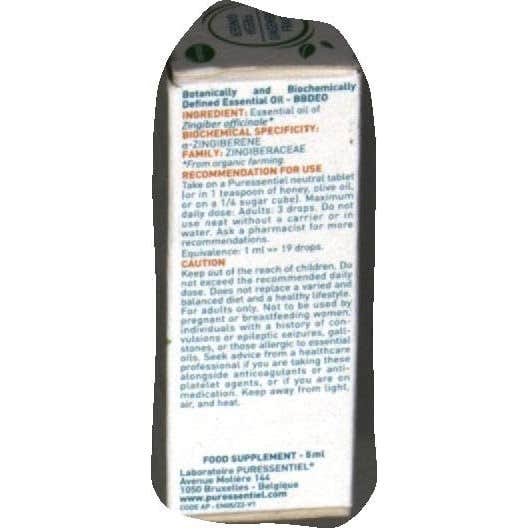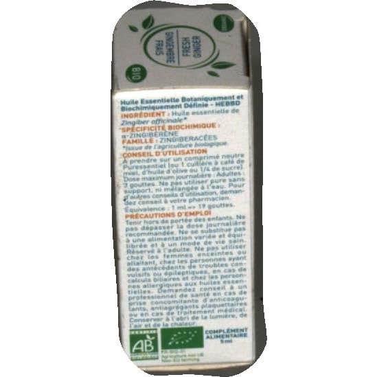 Puressentiel AE Jengibre Bio 5 ml es un aceite esencial AEBBD (aceite esencial botánica y bioquímicamente definido). El jengibre es una planta de la familia de las zingiberáceas, cuyo tallo subterráneo es un rizoma horizontal muy apreciado por su aroma y sabor picante. La planta llega a tener 90 cm de altura, con largas hojas de 20 cm.