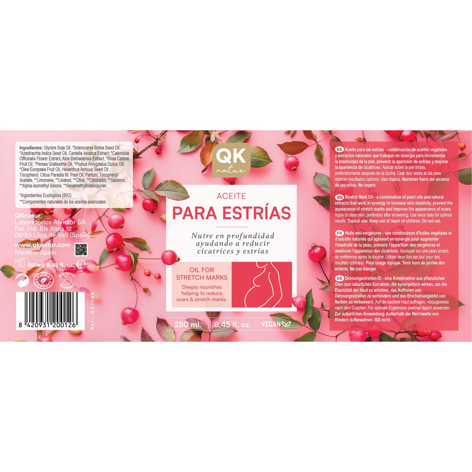 El Aceite Para Estrías de 250ml está diseñado para nutrir, reparar y mejorar la elasticidad de la piel, ayudando a reducir la apariencia de estrías y cicatrices. Su exclusiva fórmula combina aceite de rosa mosqueta, centella asiática, caléndula y aloe vera, ingredientes conocidos por sus propiedades regeneradoras y reafirmantes. Su fórmula combina aceites vegetales y extractos botánicos que favorecen la regeneración cutánea, ayudando a mantener una piel firme, flexible y saludable.