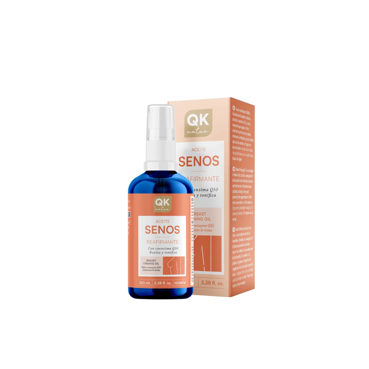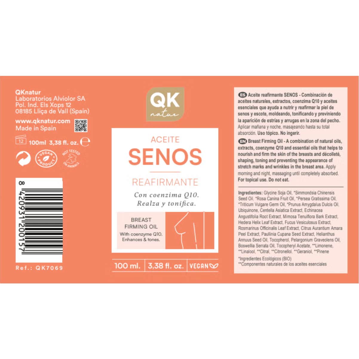 Aceite Reafirmante para Senos 100ml. Combinación de aceites naturales, extractos, coenzima Q10 y aceites esenciales que ayuda a nutrir y reafirmar la piel de senos y escote, moldeando, tonificando y previniendo la aparición de estrías y arrugas en la zona del pecho.
