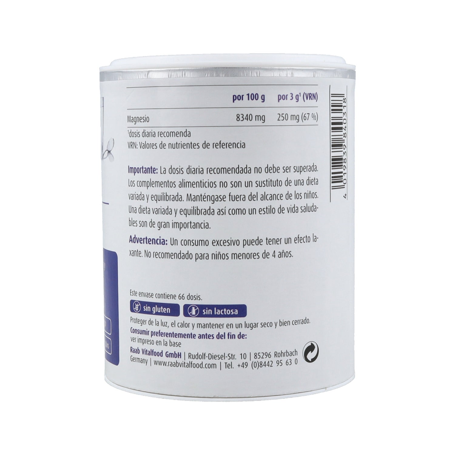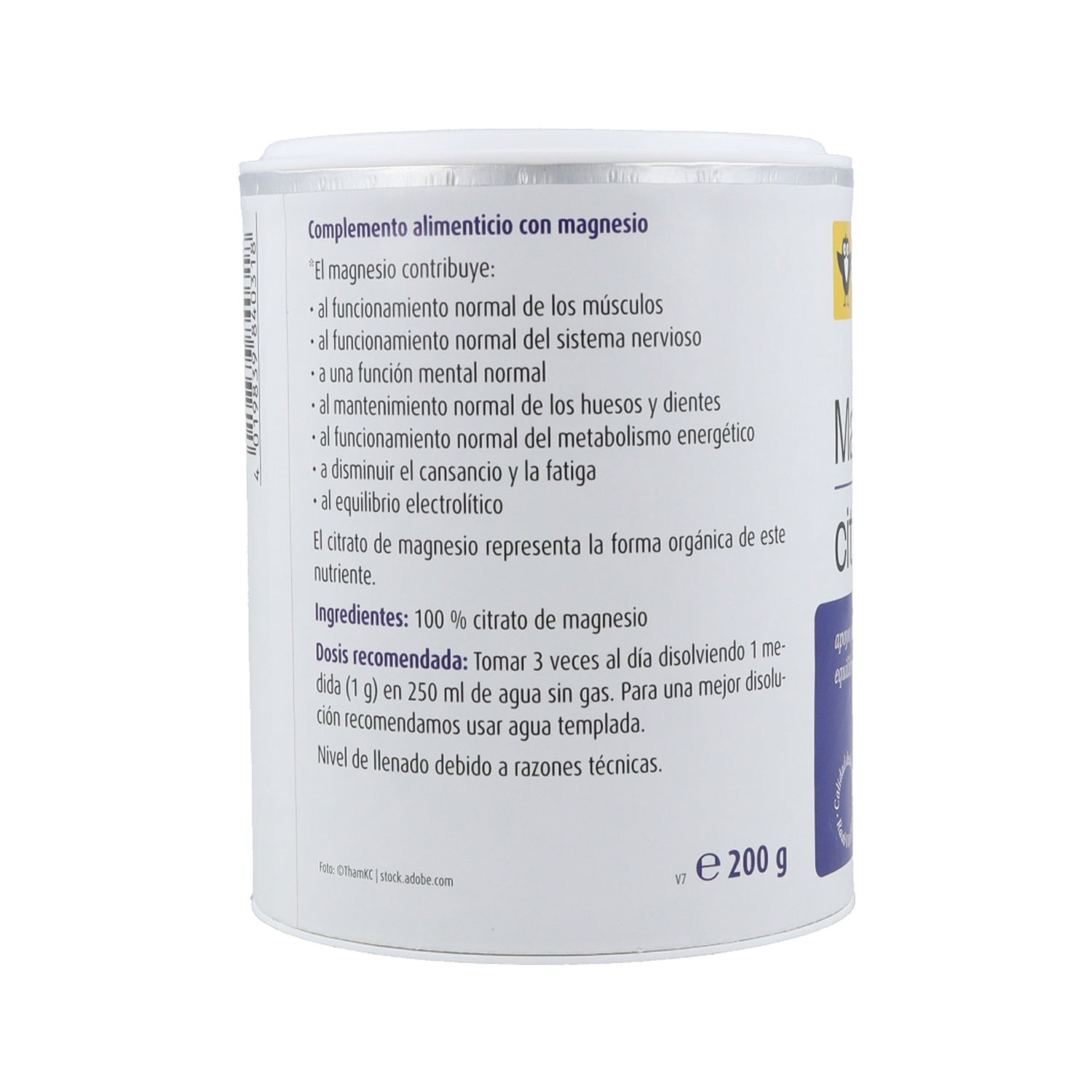 Complemento alimenticio en forma de polvos solubles, elaborado con un 100% de citrato de magnesio, siendo indicado para contribuir al buen mantenimiento de los músculos, huesos y nervios, y ayudar a reducir el cansancio y la fatiga.