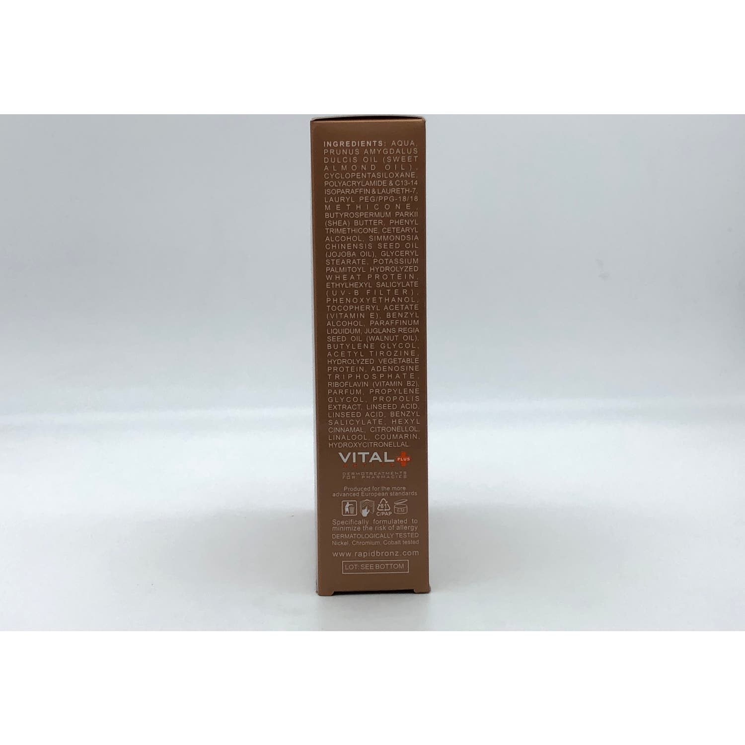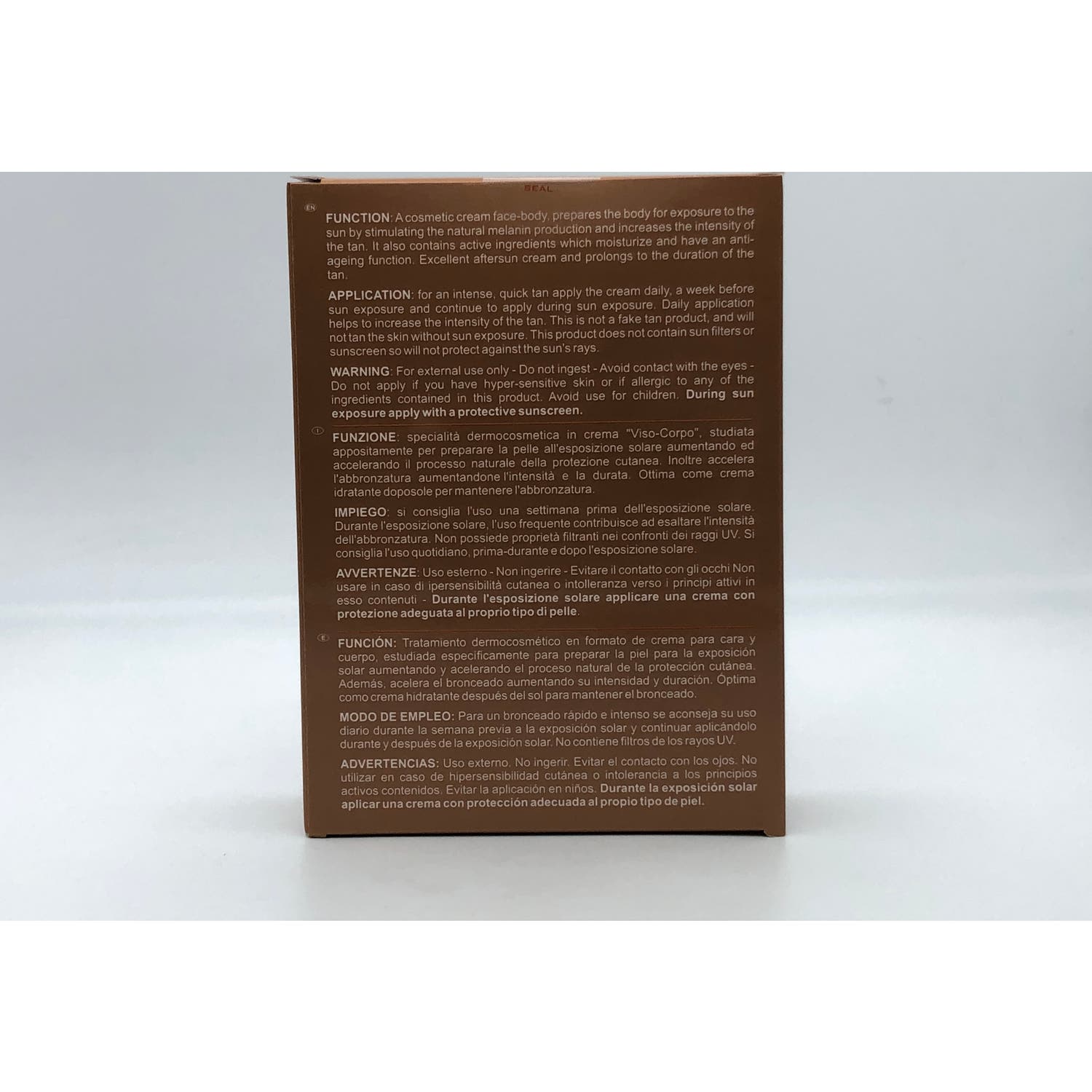 Elaborado a base de Tirosina que ayuda en la biosíntesis de la melanina, Vitamina B2 que da soporte a acelerar los procesos de oxidación y ATP (coenzima adenosín trifosfato) que aumenta la cantidad de melanina, que acelera el bronceado.