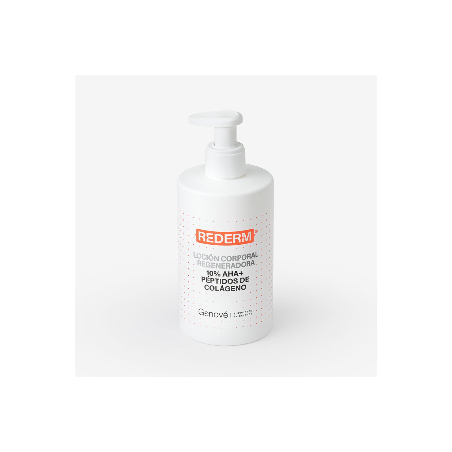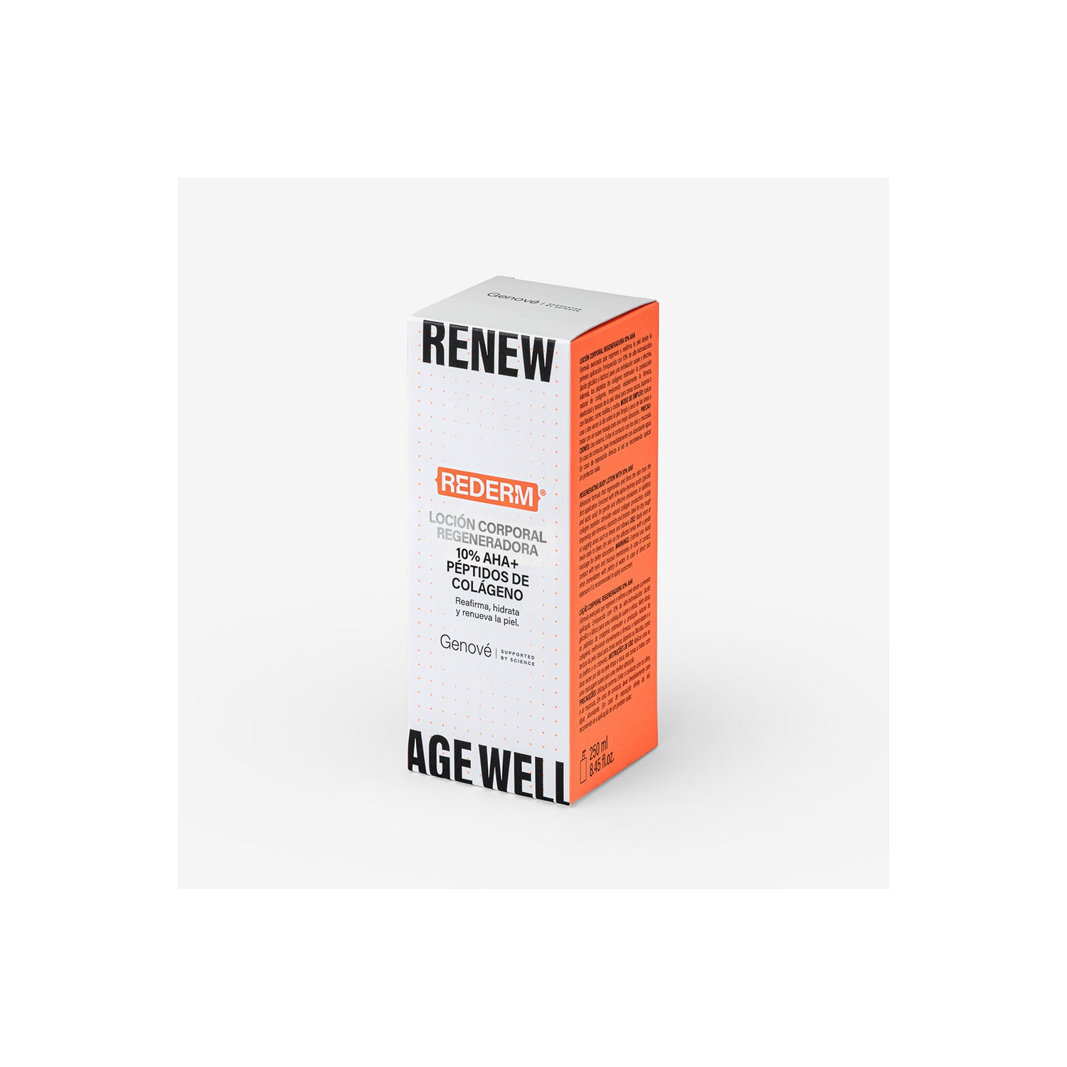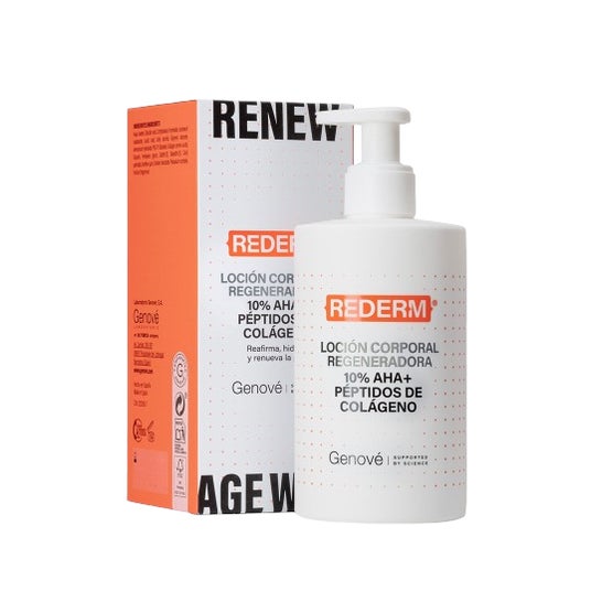 Rederm 10% AHA + Péptidos de Colágeno es una loción corporal con AHA 10% de acción renovadora que hidrata en profundidad y renueva la piel, mejorando visiblemente la firmeza, luminosidad y textura de zonas fotoenvejecidas como cuello, escote y rodillas.