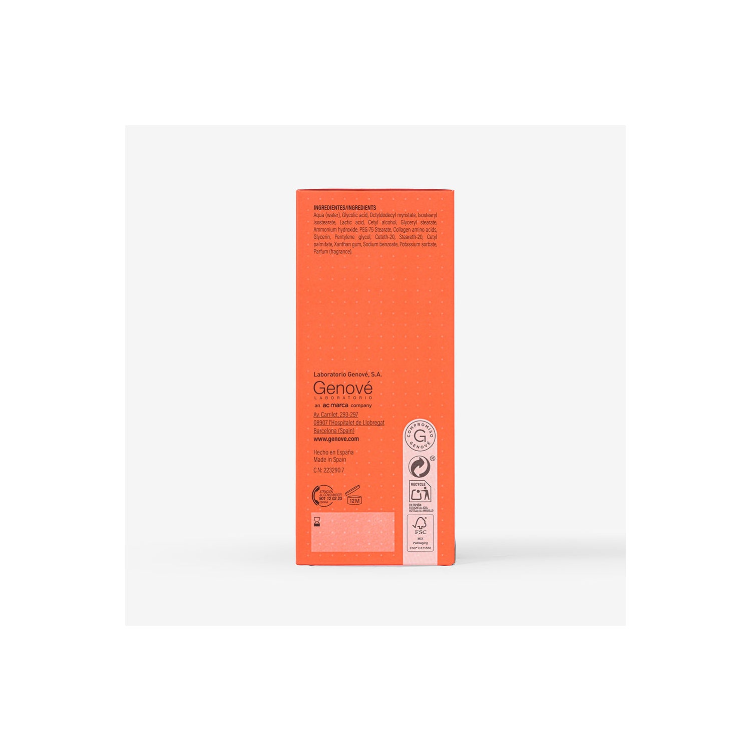 Su fórmula combina un 10% de alfahidroxiácidos (ácido glicólico y ácido láctico), que ejercen una exfoliación suave, ayudando a mejorar la textura y la luminosidad, junto con péptidos de colágeno que estimulan la síntesis de colágeno y elastina para reforzar la elasticidad y la firmeza de la piel.