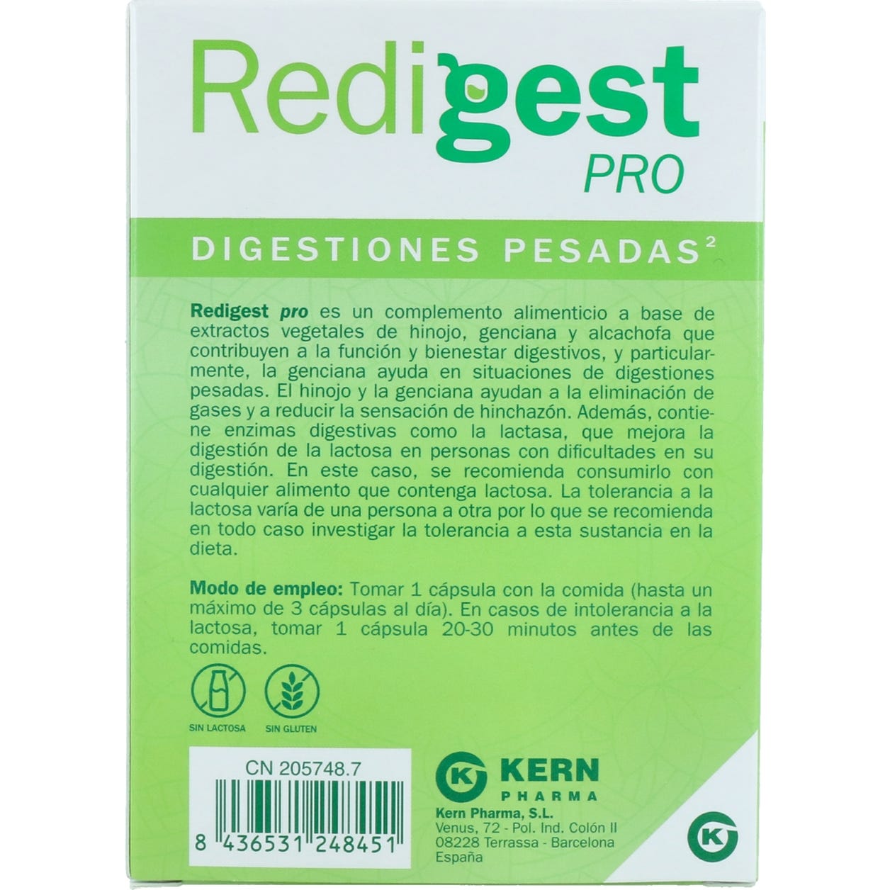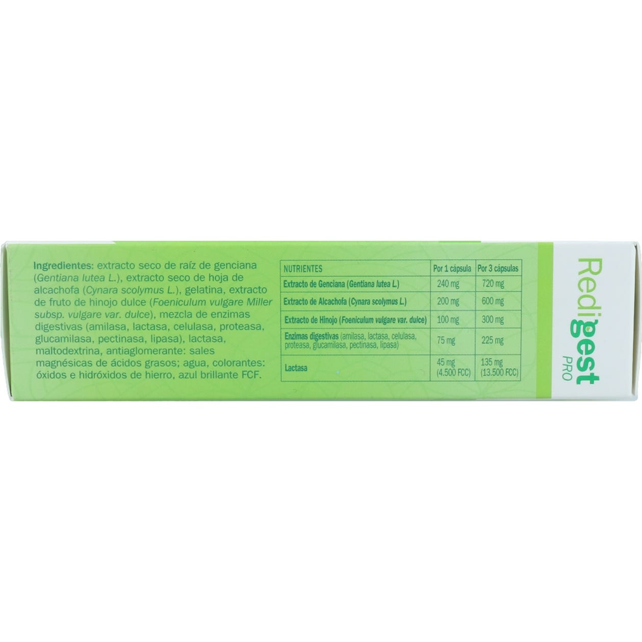 Extracto seco de raíz de genciana (Gentiana lutea L.), extracto seco de hoja de alcachofa (Cynara scolymus L.), gelatina, extracto de fruto de hinojo dulce (Foeniculum vulgare Miller subsp. vulgare var. dulce), mezcla de enzimas digestivas (amilasa, lactasa, celulasa, proteasa, glucamilasa, pectinasa, lipasa), lactasa, maltodextrina, antiaglomerante: sales magnésicas de ácidos grasos; agua, coloran-tes: óxidos e hidróxidos de hierro, azul brillante FCF