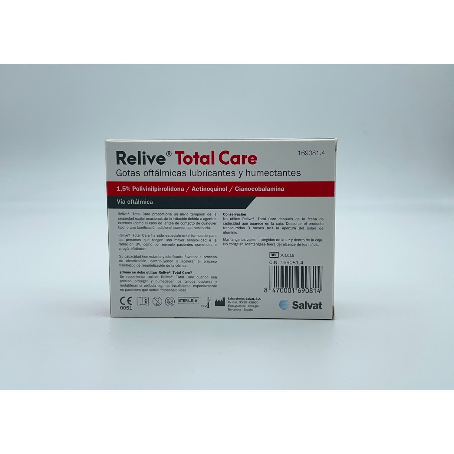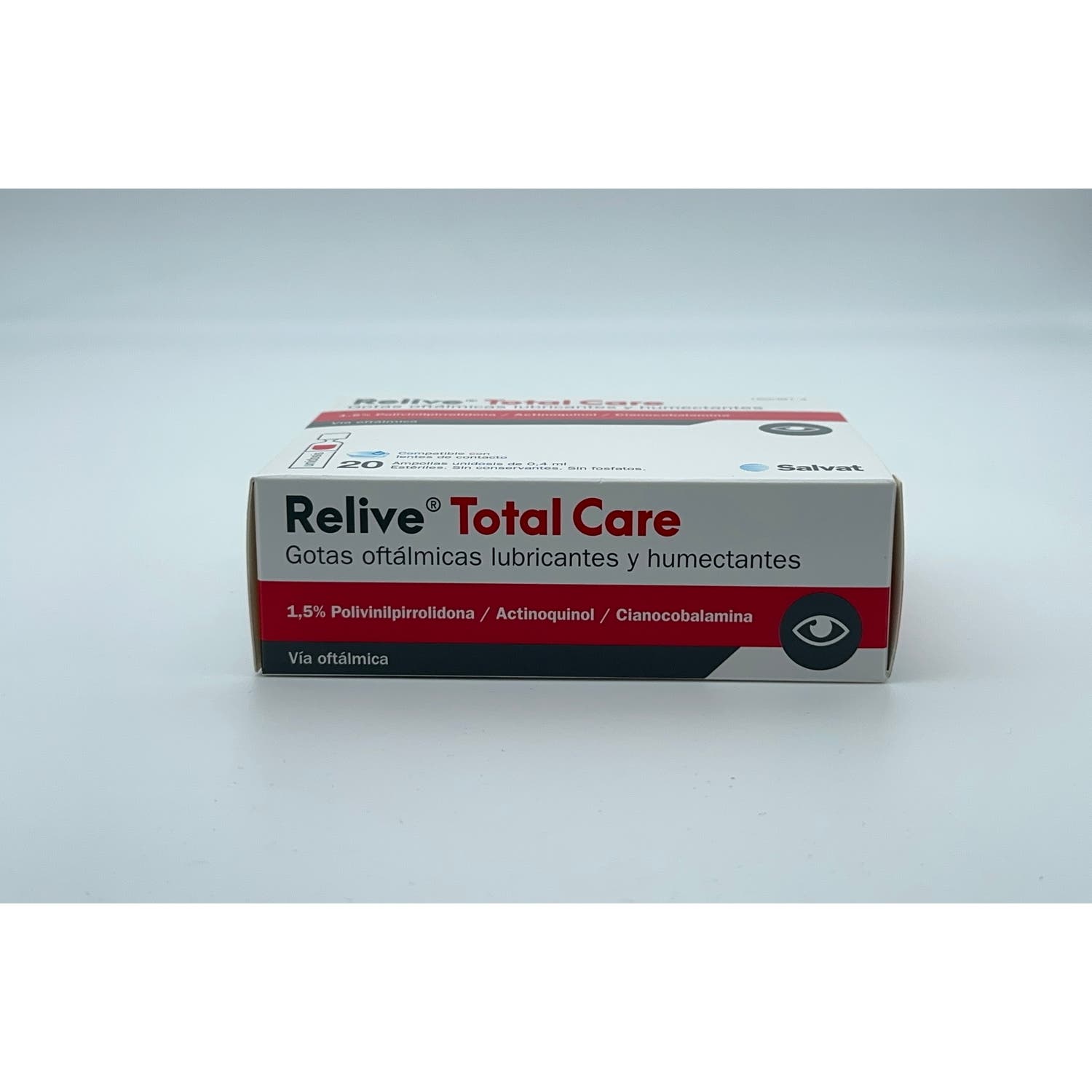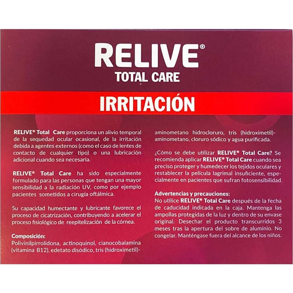 Relive Total Care gotas oftálmicas 20 monodosis son unas prácticas gotas lubricantes y humectantes indicadas para la recuperación de los ojos tras el periodo postcirugía oftálmica. Gracias a su intensa acción lubricante, favorecen la disminución de la sequedad ocular ocasional y la irritación causada por agentes externos. Este líquido estéril contiene polivinilpirrolidona, compuesto que aumenta el tiempo de retención del agua en la superficie ocular y calma cualquier molestia o picor. Presenta un color rojizo a causa de la presencia de cianocobalamina, sin necesidad de manchar tus lentes ni pigmentar tus lágrimas.