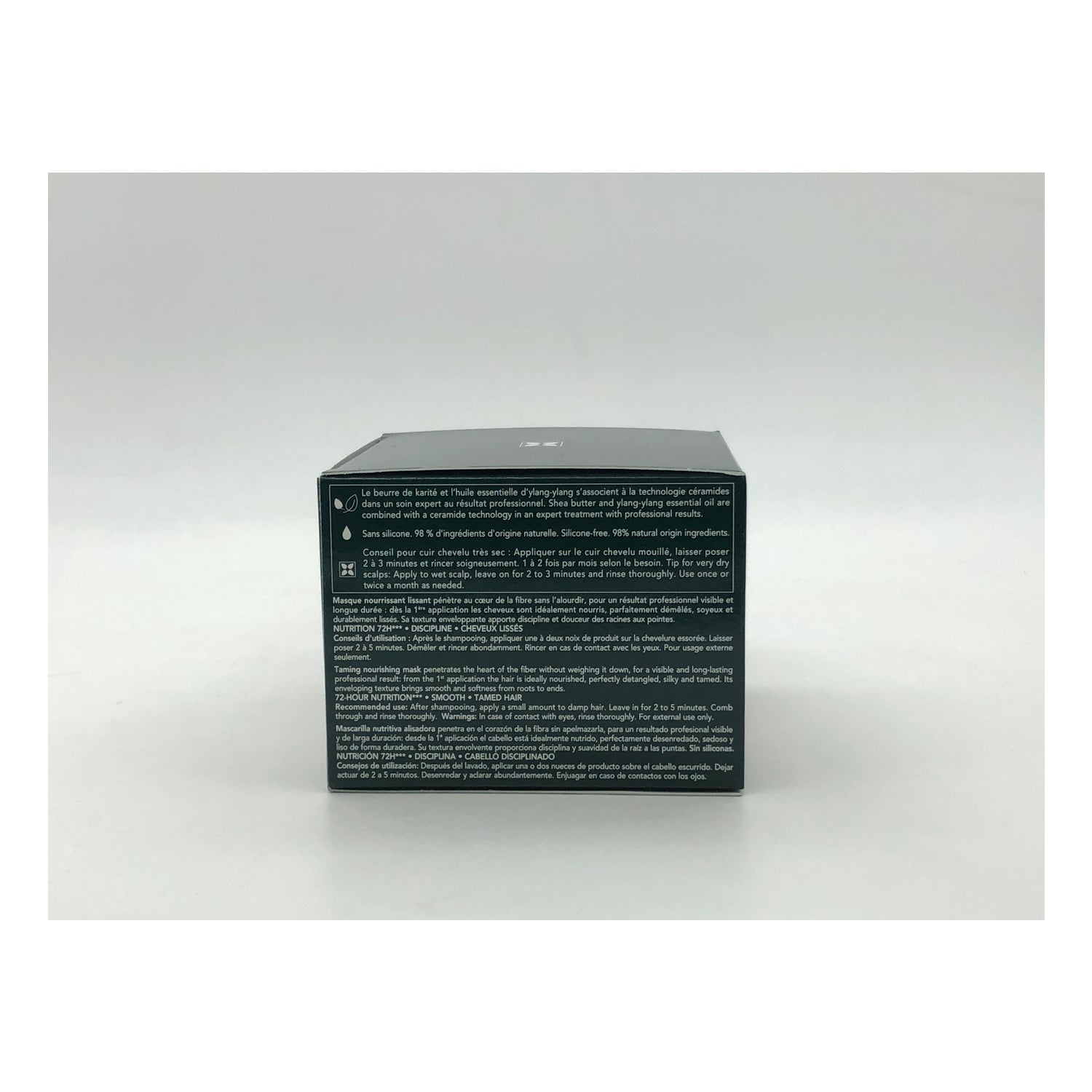 Contiene manteca de karité para nutrir el cabello, pectinas de membrillo que ayudan a alisar las cutículas capilares y microproteínas de trigo que aportan un efecto reparador.
