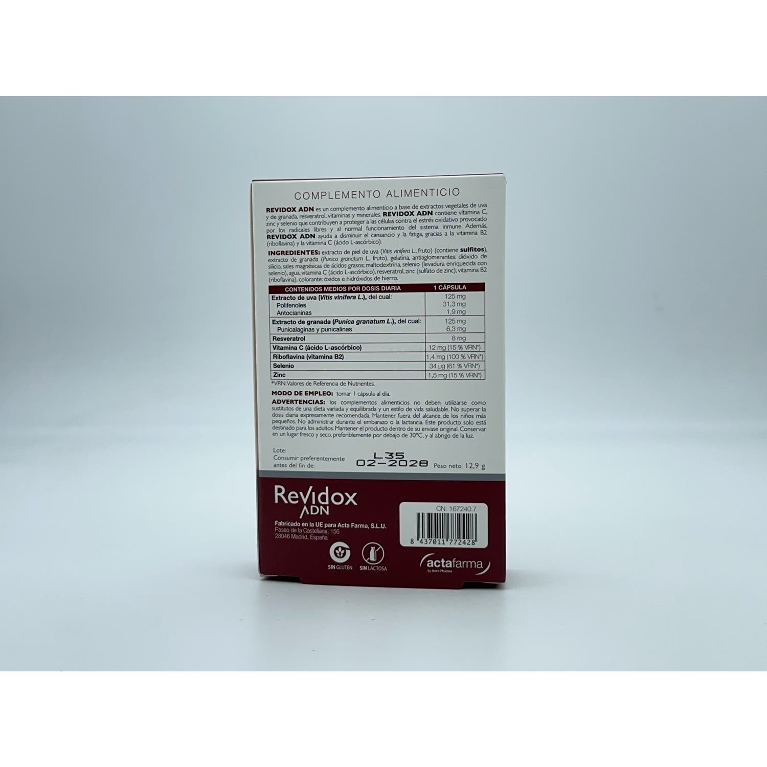 Elaborado a base de extracto de granada y extracto de uva enriquecido con resveratrol, vitamina B2 (riboflavina), vitamina C y minerales como el selenio y el zinc. Además, fortalece el sistema inmunitario, combate el desgaste del cuerpo y el daño oxidativo, contribuye a la síntesis normal del ADN y posee efectos antioxidantes ante la contaminación y las radiaciones.