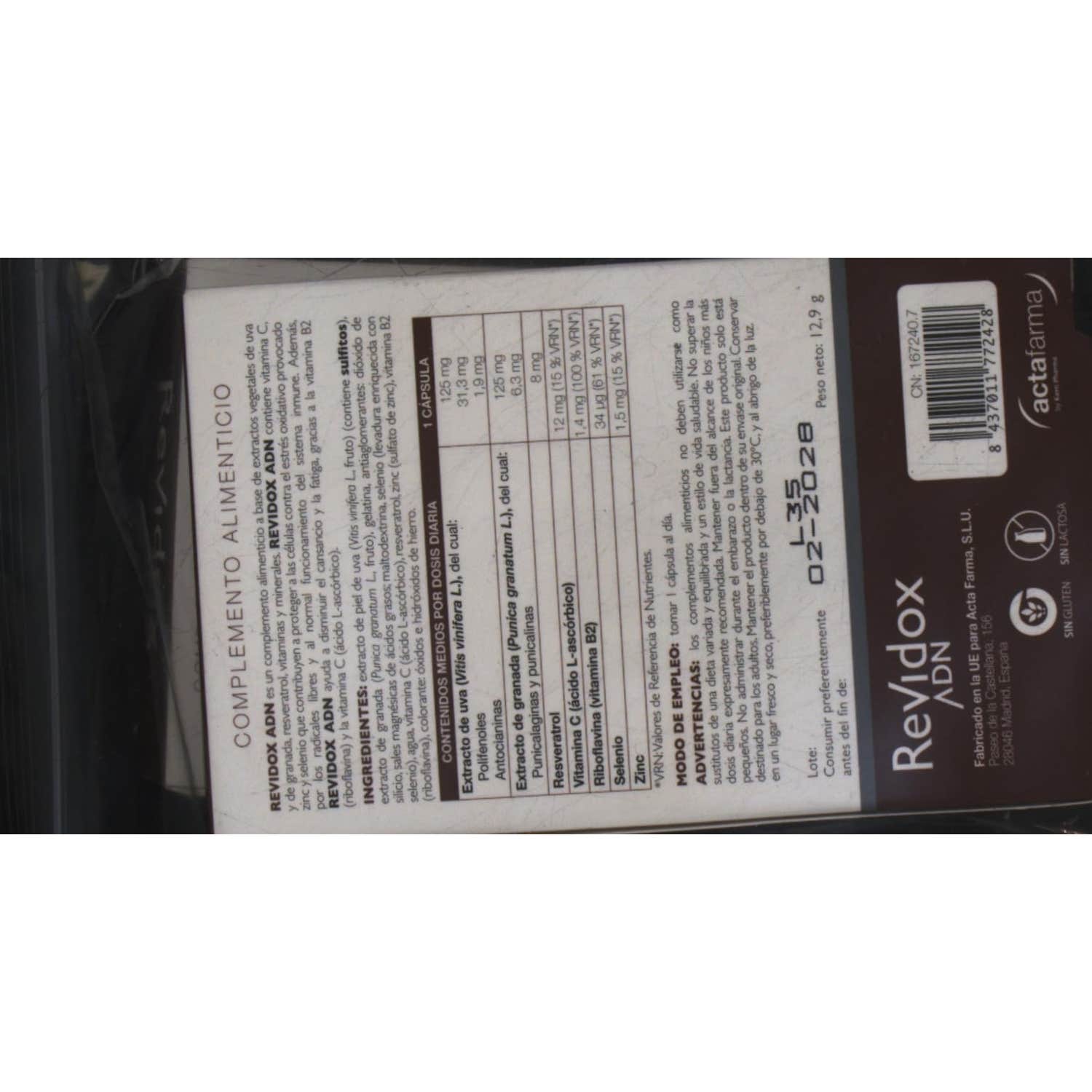 Revidox ADN 2x28caps es un complemento alimenticio con propiedades revitalizantes elaborado a base de extracto de granada y extracto de uva enriquecido con resveratrol, vitamina B2 (riboflavina), vitamina C y minerales como el selenio y el zinc.