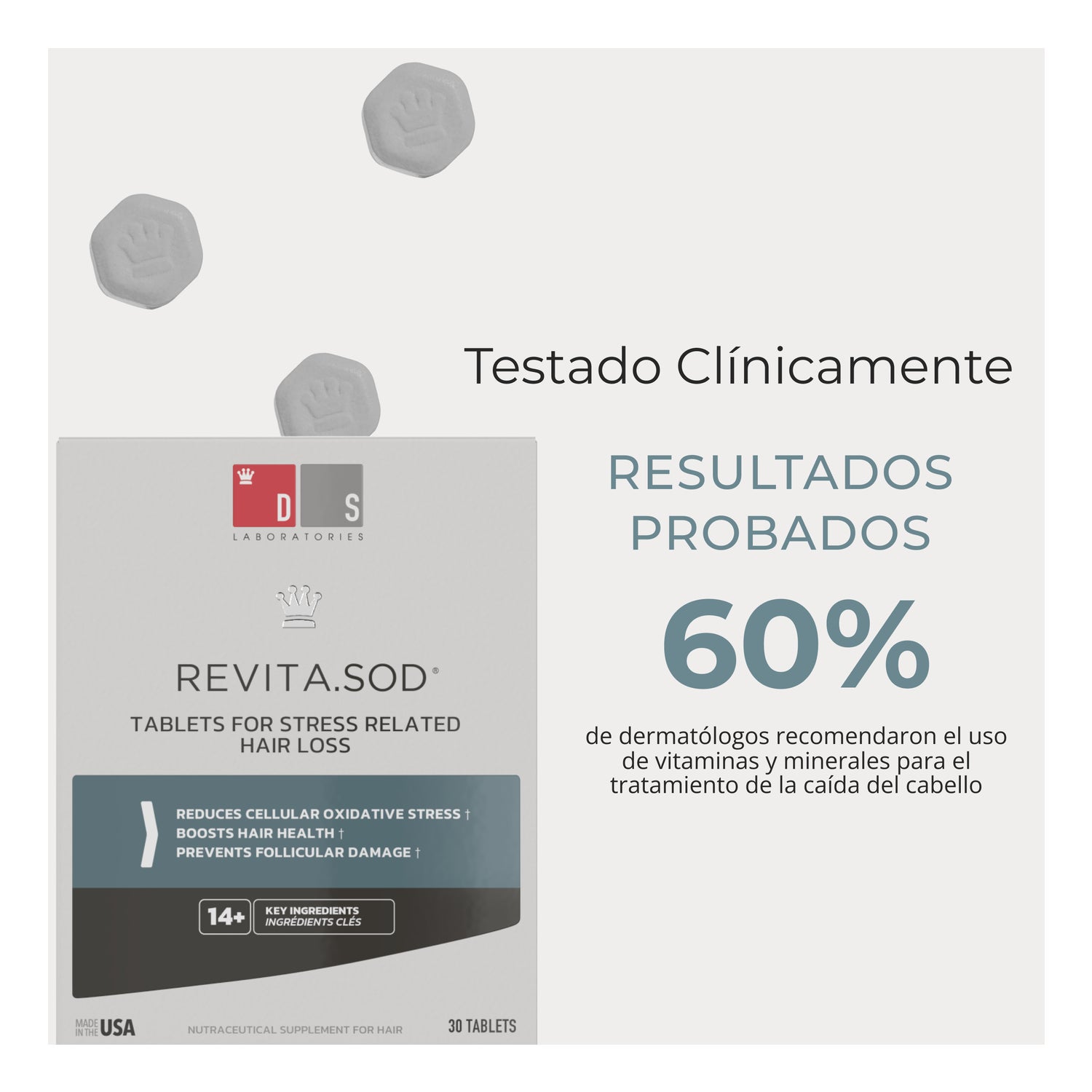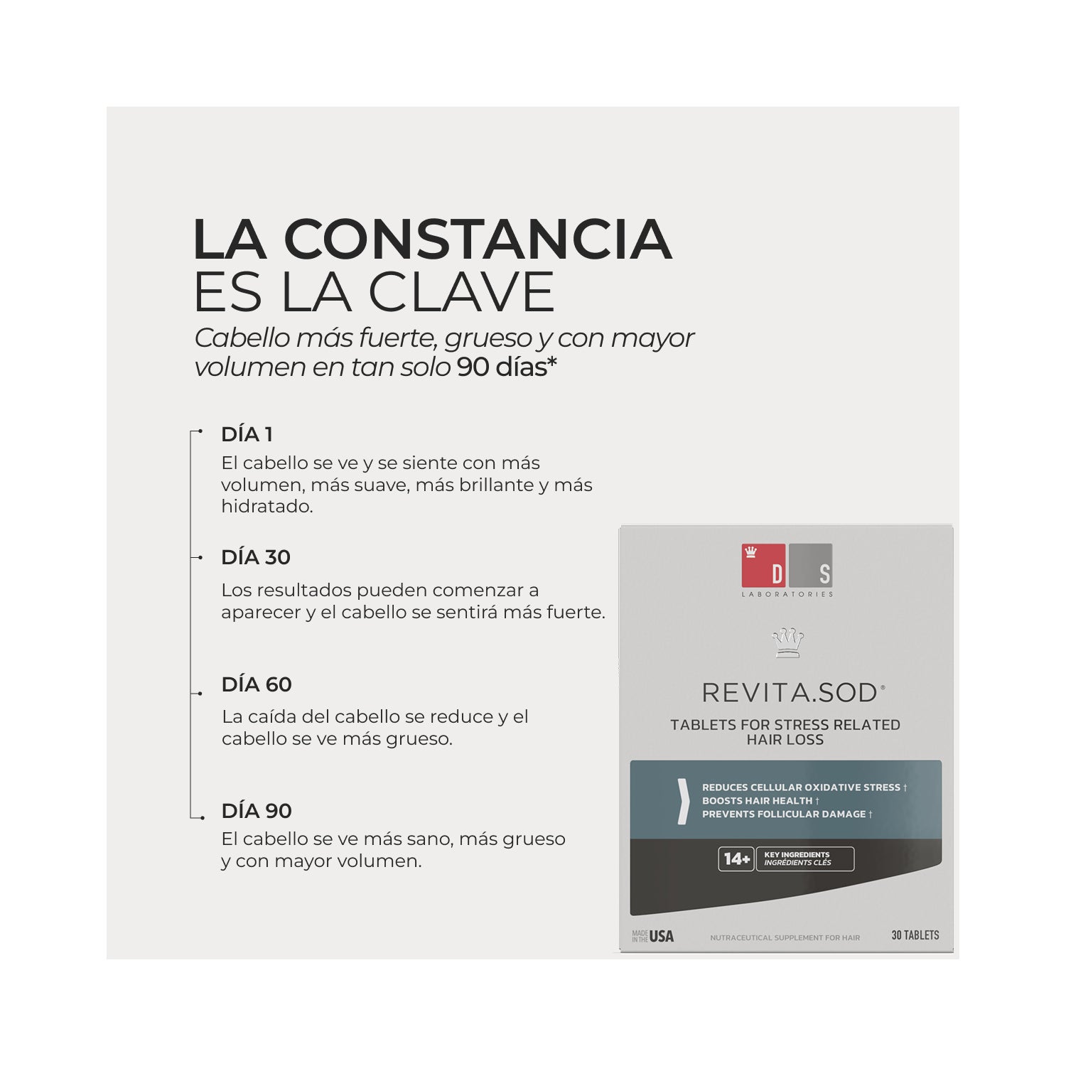 Revita SOD Caída Cabello 30comp es un complemento alimenticio que estimula el crecimiento del cabello y contrarresta los efectos del estrés y el daño oxidativo.