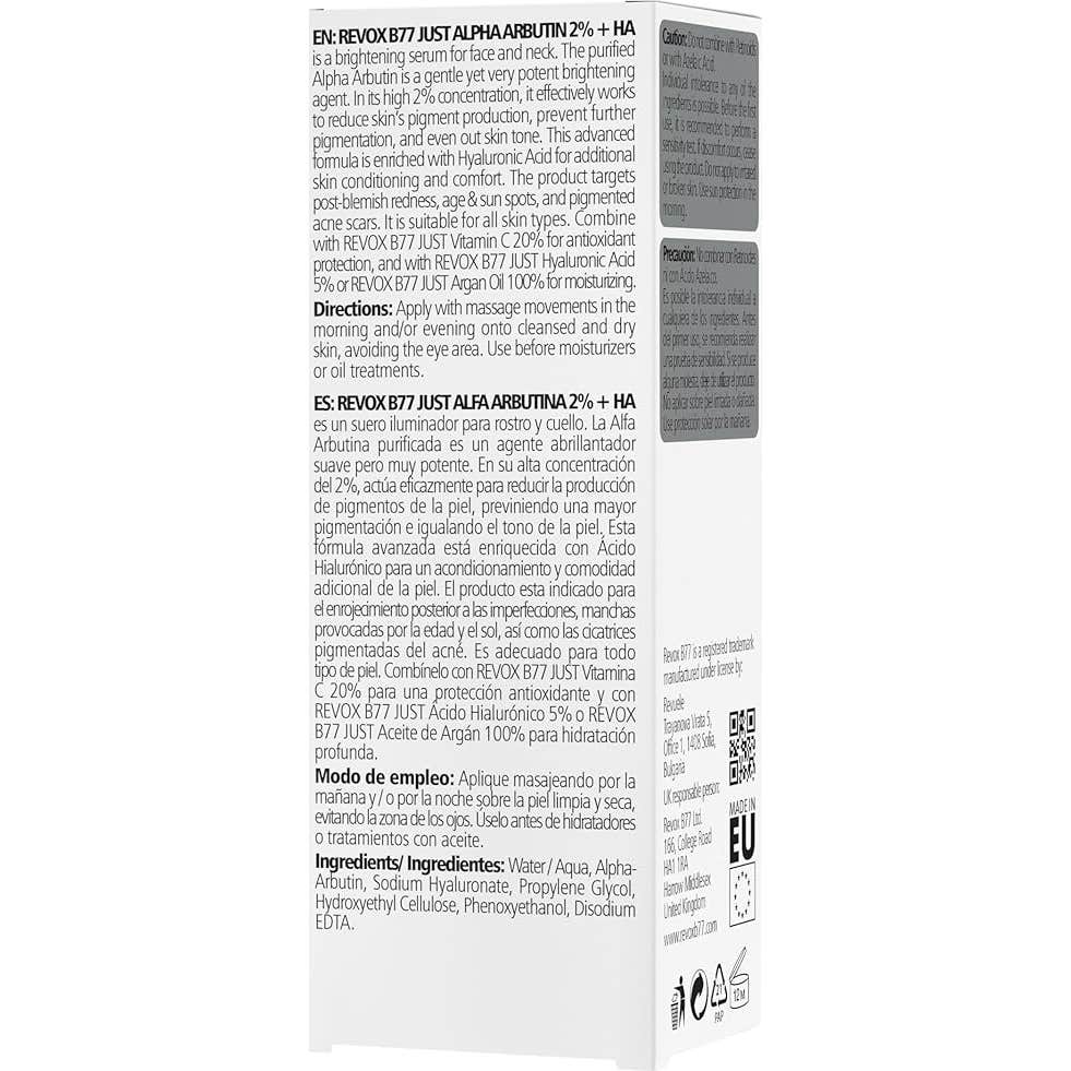 Revox B77 Just Alpha Arbutin 2% + HA 30ml es un sérum iluminador diseñado para rostro y cuello, formulado para tratar manchas y unificar el tono de la piel. Contiene alfa arbutina al 2% y ácido hialurónico, ideal para reducir: