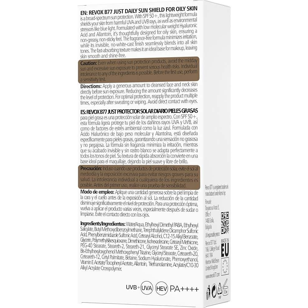 Revox B77 Just Daily Sun Shield For Oily Skin 30ml es un protector solar facial diseñado para pieles grasas, mixtas y normales. Su fórmula avanzada con SPF50+ controla el exceso de brillo, proporcionando un acabado mate y aterciopelado, ideal para integrar en la rutina diaria de cuidado facial y maquillaje.