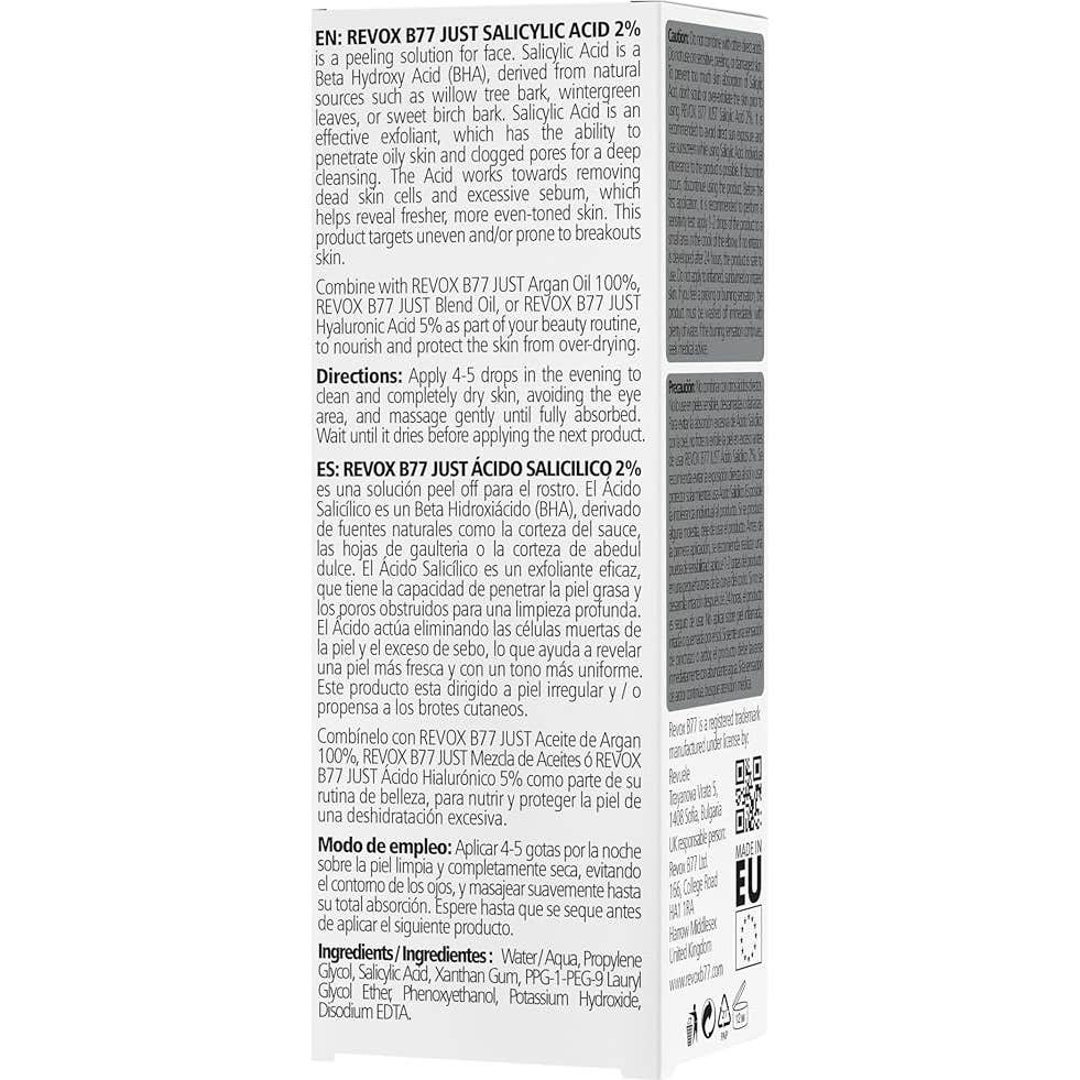 Revox B77 Just Salicylic Acid 2% 30ml es un sérum exfoliante diseñado para lograr una piel uniforme y libre de imperfecciones. Formulado específicamente para el rostro, este producto es ideal para combatir: