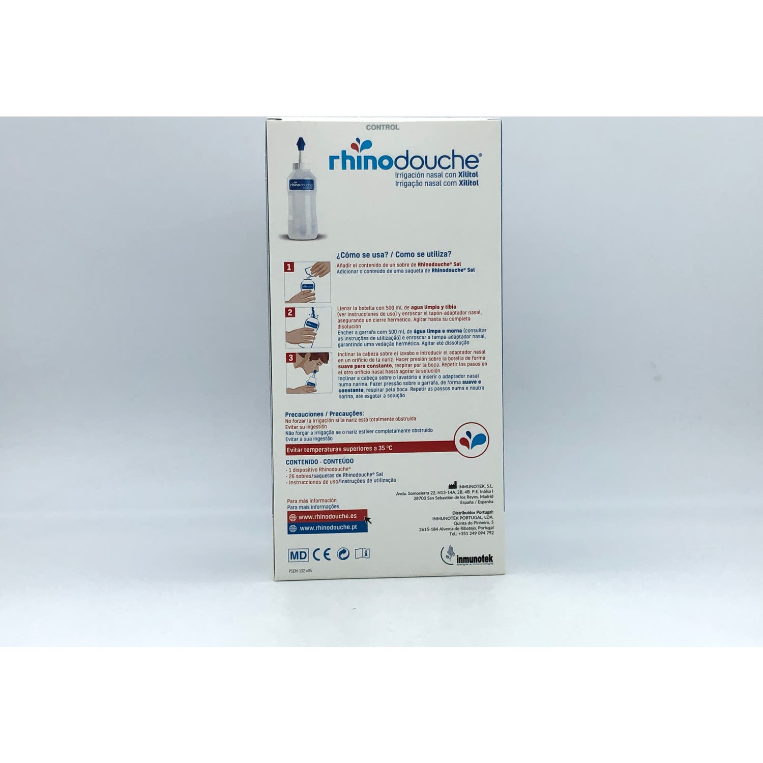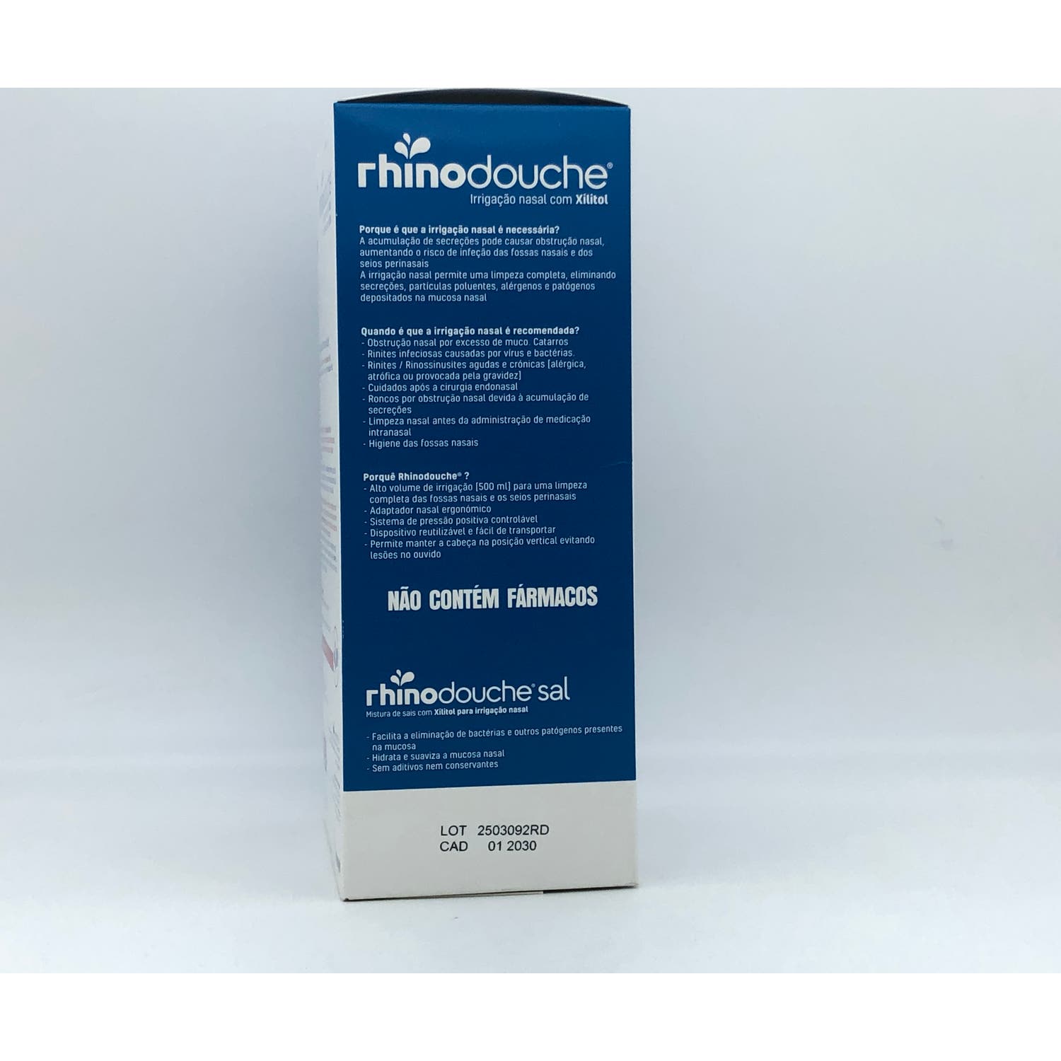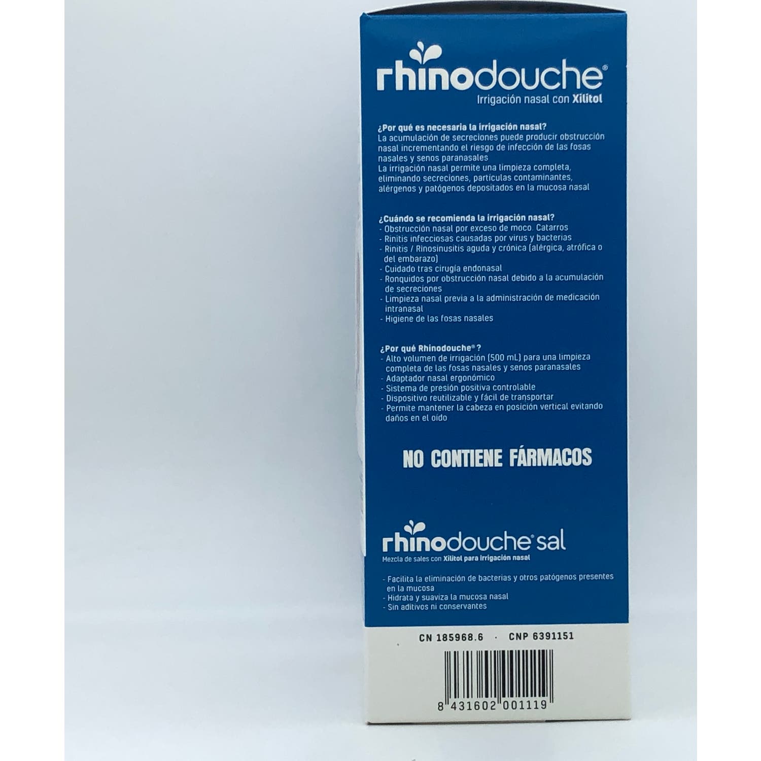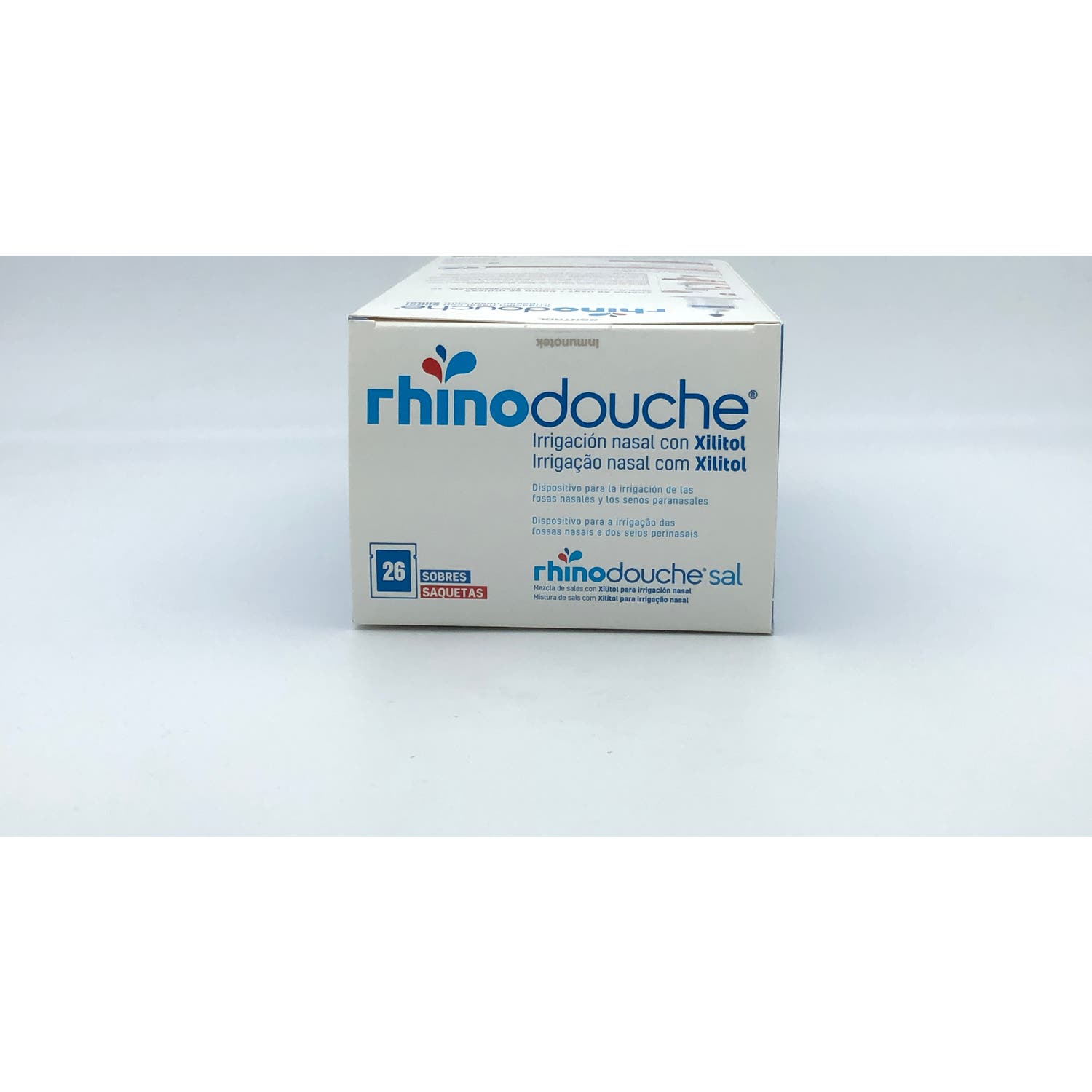 Además, cuenta con un estuche con 26 sobres de Rhinodouche Sal. Cada sobre contiene una mezcla de sales que se utiliza para preparar una solución de irrigación especialmente diseñada para la limpieza y el cuidado de la mucosa nasal.