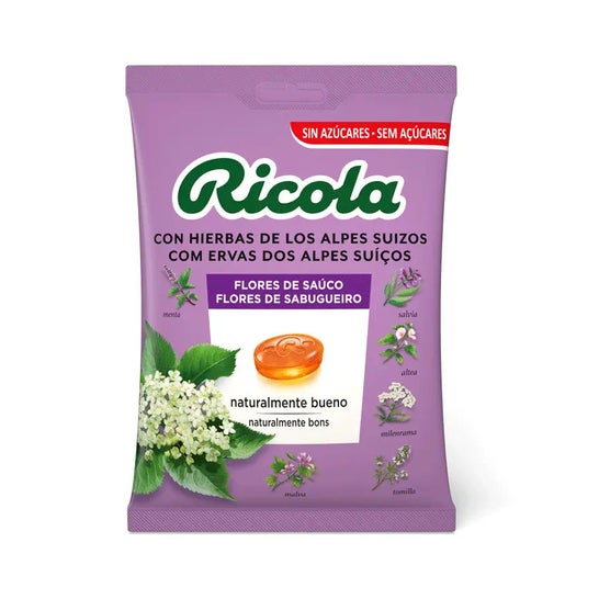 Edulcorante (isomalt), acidulante (ácido málico), extracto (0,5%) de flor de saúco y la mezcla de plantas aromáticas Ricola, zumo de limón concentrado, edulcorante (glucósidos de esteviol), aromas naturales, concentrado de boniato y zanahoria, mentol.