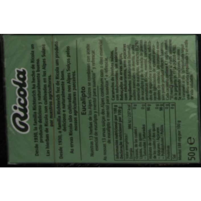 Los Ricola Caramelos Eucaliptus tienen un sabor característico y producen un suave efecto del tipo balsámico que alivia y refresca la garganta y las vías respiratorias altas. Los caramelos de eucaliptus de Ricola contienen un porcentaje muy importante de cineol, que se extrae de las hojas del árbol del eucaliptus, cuyas propiedades curativas para los estados gripales, catarrales o de tos persistente, son conocidos desde hace muchísimo tiempo por la medicina natural tradicional.