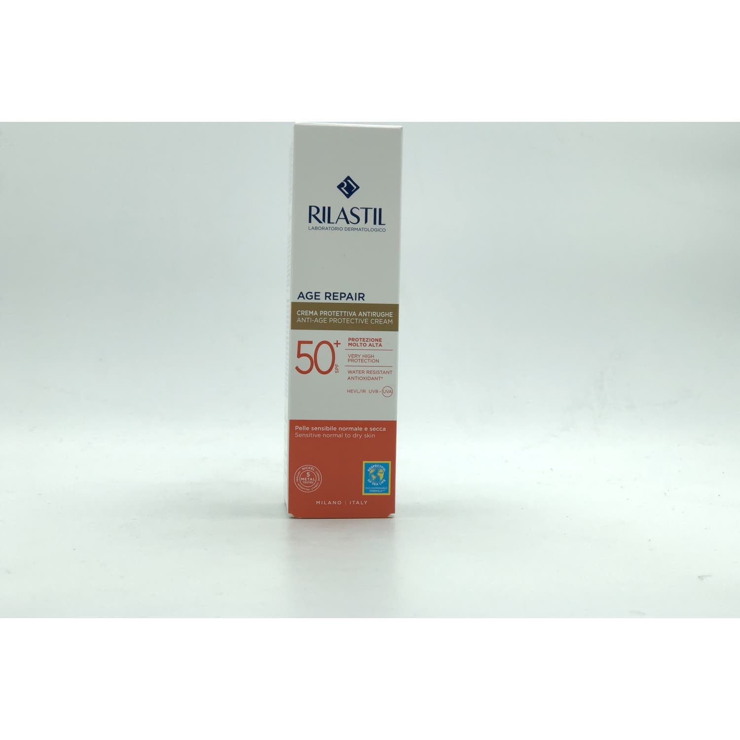 Rilastil Age Repair Crema Protectora Antiarrugas SPF50+ 40ml es un fotoprotector antiedad de amplio espectro que ayuda a proteger la piel frente a la radiación UVB y UVA para prevenir el eritema solar. Deja una piel matificada, calmada, y protege de la luz azul.