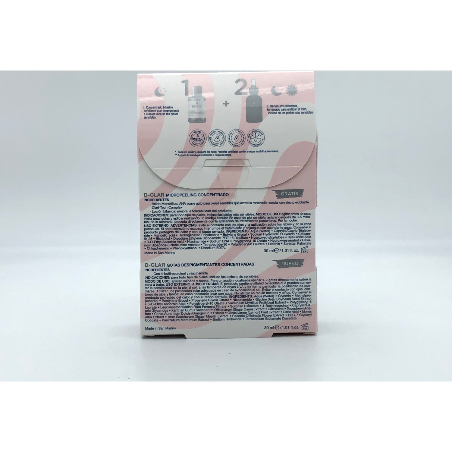 Tratamiento facial formulado a base de activos despigmentantes, AHA de la fruta y DNA sódico. El pack incluye 1 Dclar gotas y 1 micropeeling concentrado. Ayuda a exfoliar y atenuar el exceso de pigmentación del rostro. Es adecuado en casos de manchas solares opor inflamaciones. Indicado para todo tipo de pieles.