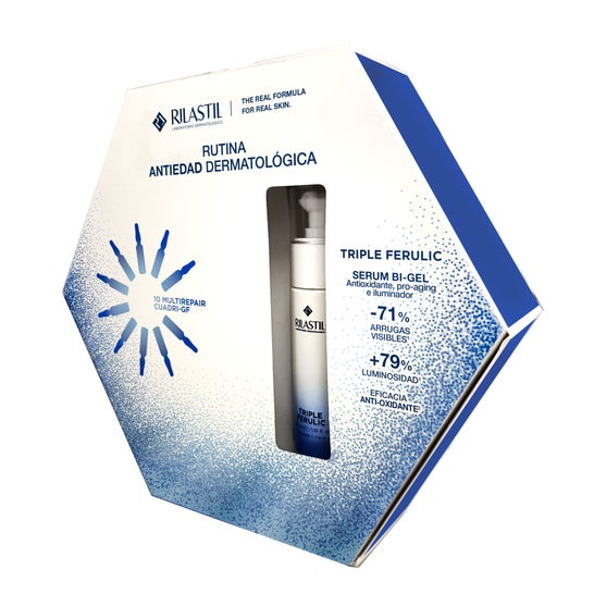 Triple Ferulic: Sérum bi-gel anti-aging con péptidos, ácido ferúlico y superóxido dismutasa. ILUMINA Y UNIFICA el tono de la piel, COMBATE LOS SIGNOS DEL ENVEJECIMIENTO, reduciendo arrugas y líneas de expresión y PROTEGE CONTRA LA OXIDACIÓN Y LOS RADICALES LIBRES, previniendo la oxidación de la piel y el envejecimiento prematuro de la piel. Es adecuado para cualquier tipo de piel.