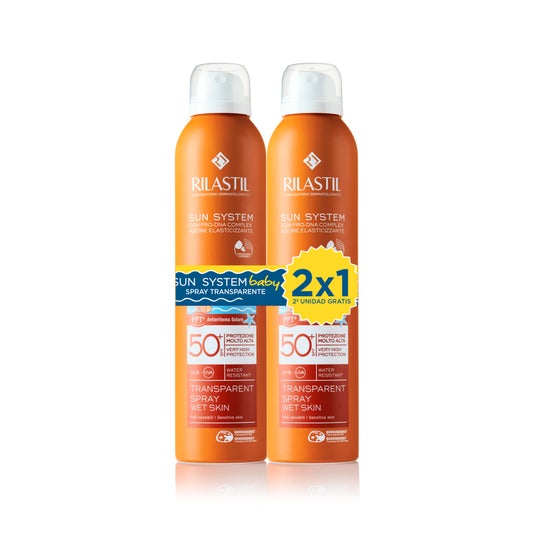 Rilastil Sun System Baby Spray Solar Corporal Transparente SPF50+ 2x200ml es un pack compuesto por dos protectores solares de factor alto para proteger la piel del sol durante todo el verano.