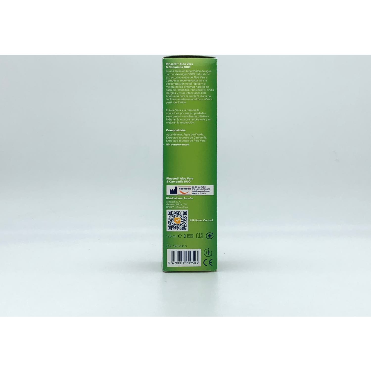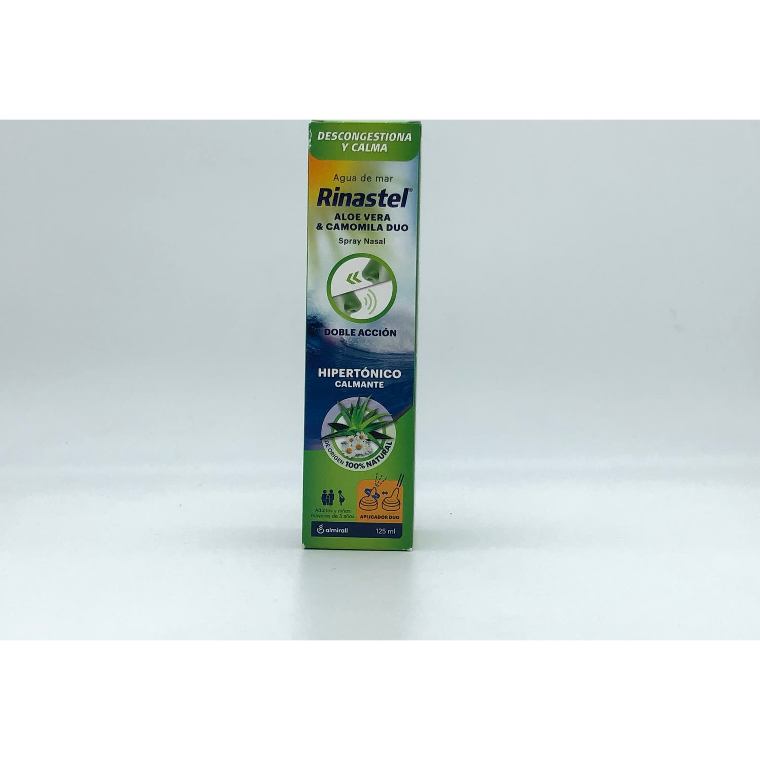 Rinastel Aloe Vera & Camomila Spray Nasal 125 Ml es una solución hipertónica de Agua de Mar 100% natural que contiene extractos acuosos de Aloe Vera y Camomila.