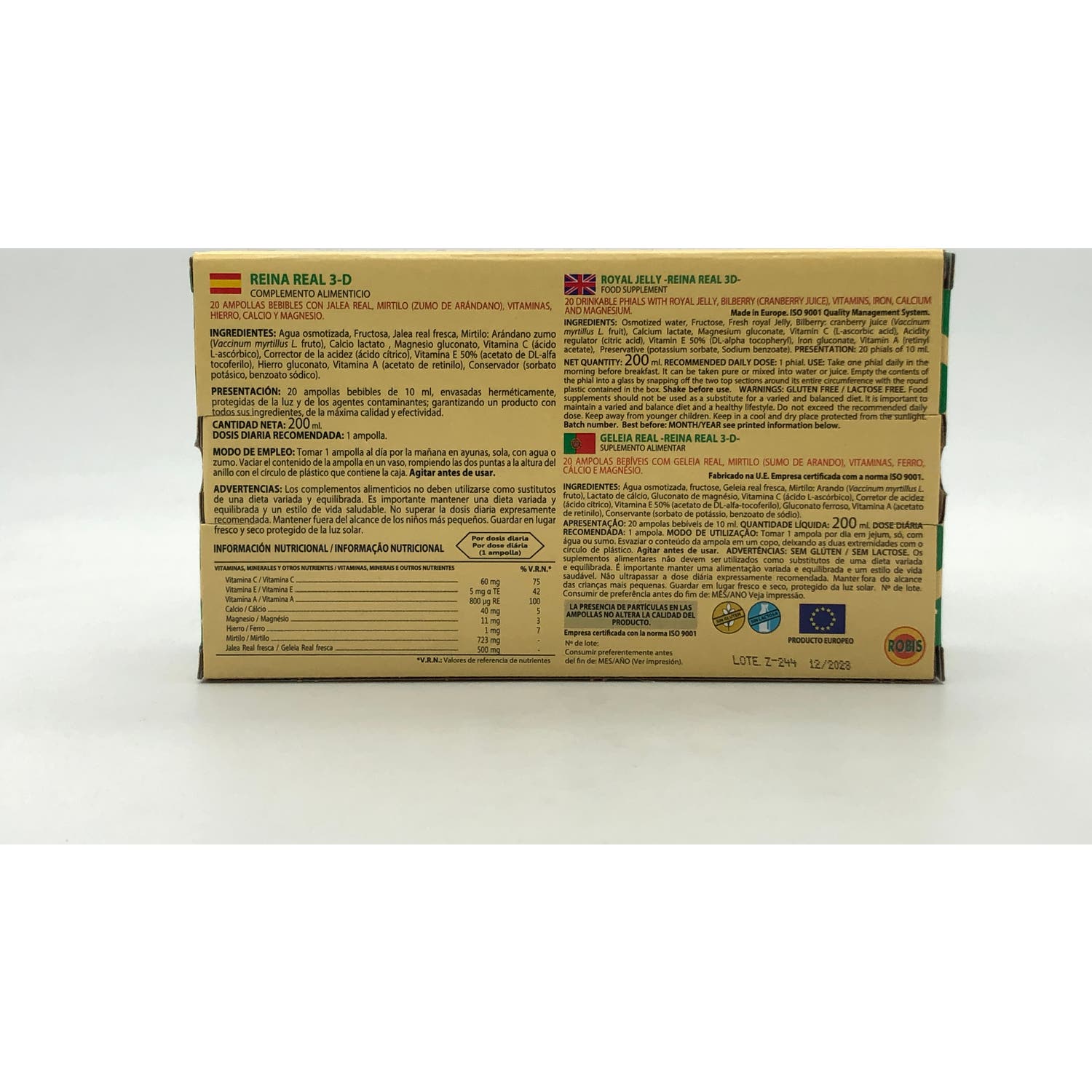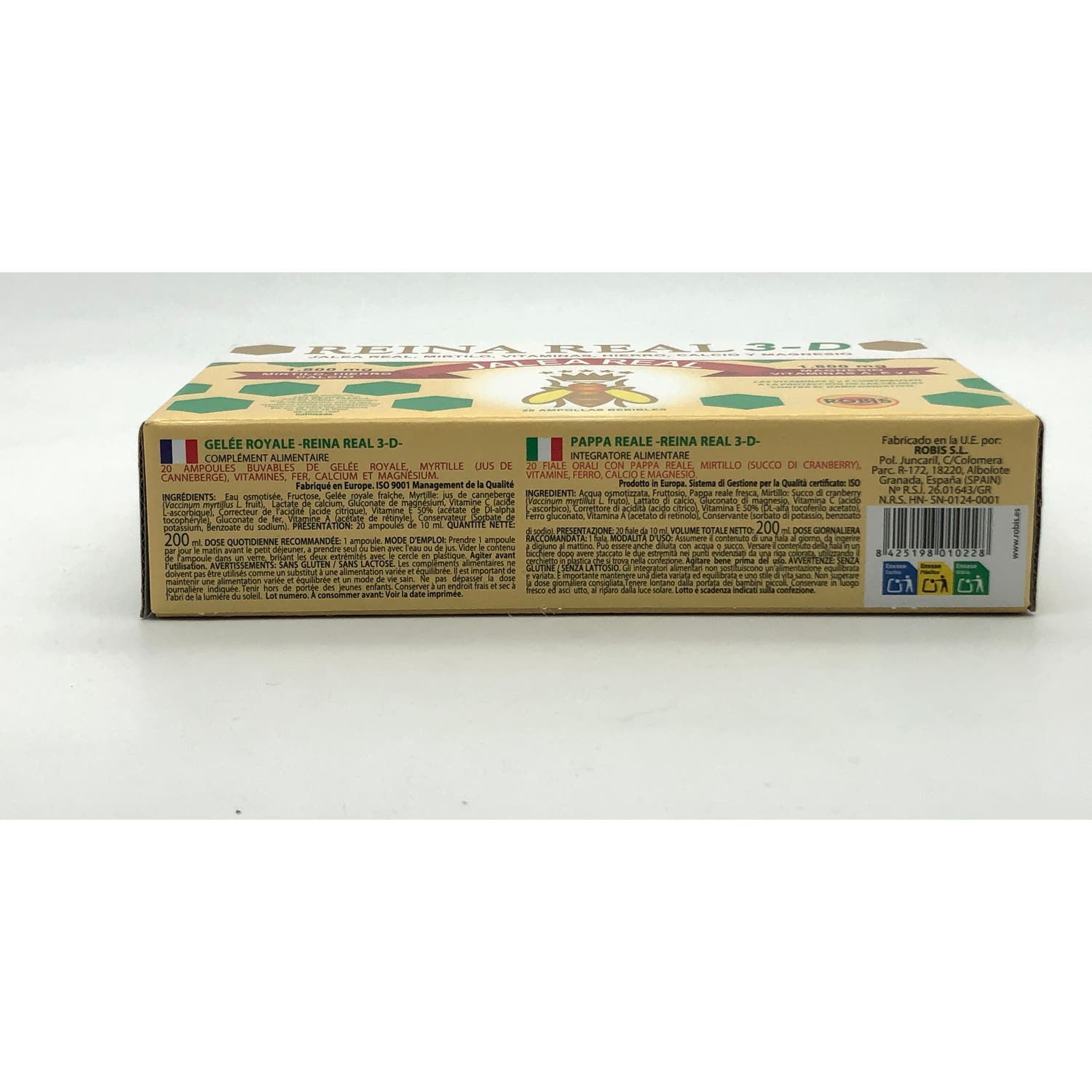 Robis Reina Real 3D 20 Viales es un complemento alimentico en formato viales individuales formulado a base de jalea real.