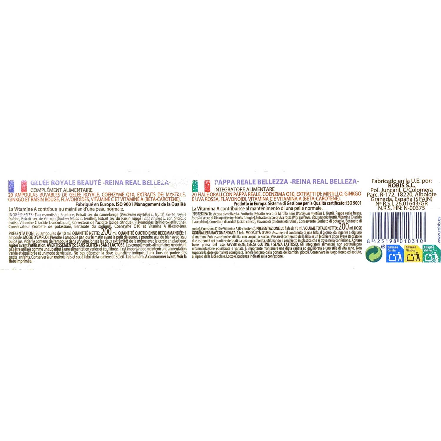 Jalea real que ayuda a mejorar el equilibrio físico-químico de la piel, la piel seca y malnutrida, las uñas débiles y quebradizas, el cabello frágil y seco, y previene la caída del cabello. Indicado para trastornos circulatorios, fragilidad capilar, celulitis, piernas pesadas, facilita el bronceado. Formato 20 ampollas.