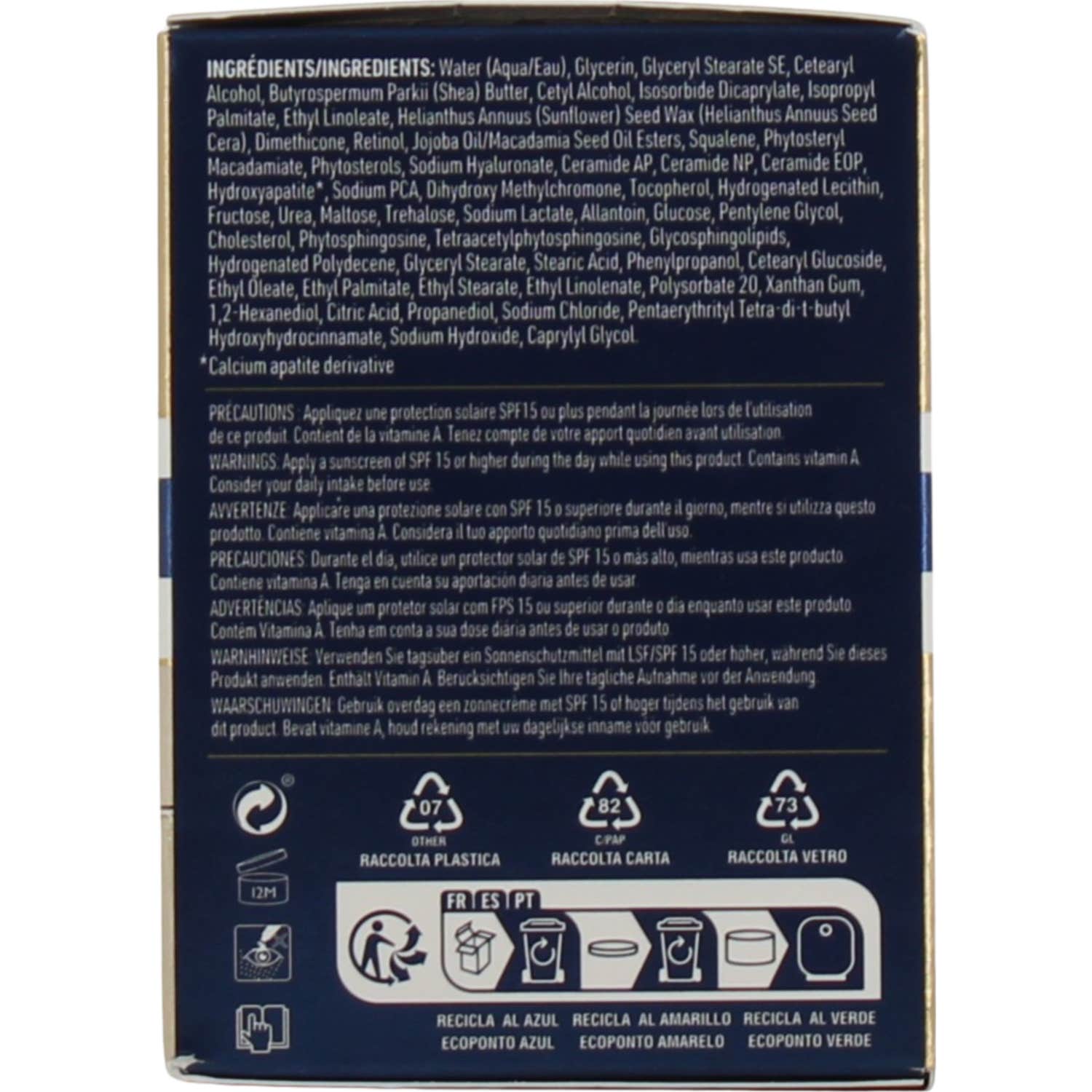 El principal componente de esta fórmula es el Retinol RoC, un ingrediente antiedad que se ha comprobado que es siete veces más efectivo que el retinol convencional y hasta dos veces más estable que otros productos similares. Esto garantiza una acción continua y específica. Además, se complementa con: