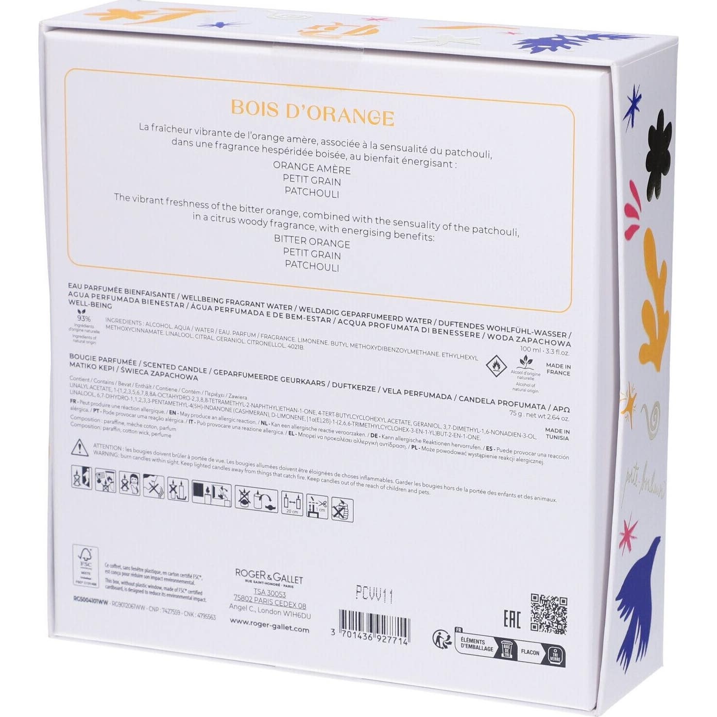 Roger & Gallet Madera de Naranjo Pack Agua Perfumada + Vela incluye un agua perfumada de 100 ml y una vela perfumada para aromatizar el hogar con notas cítricas y amaderadas. El agua perfumada está enriquecida con esencia natural de naranja amarga.