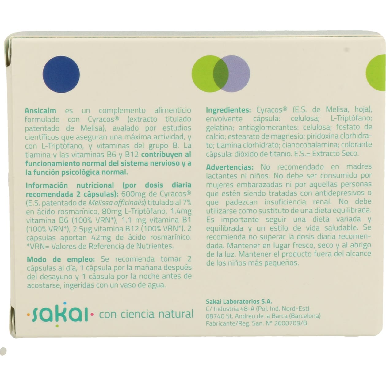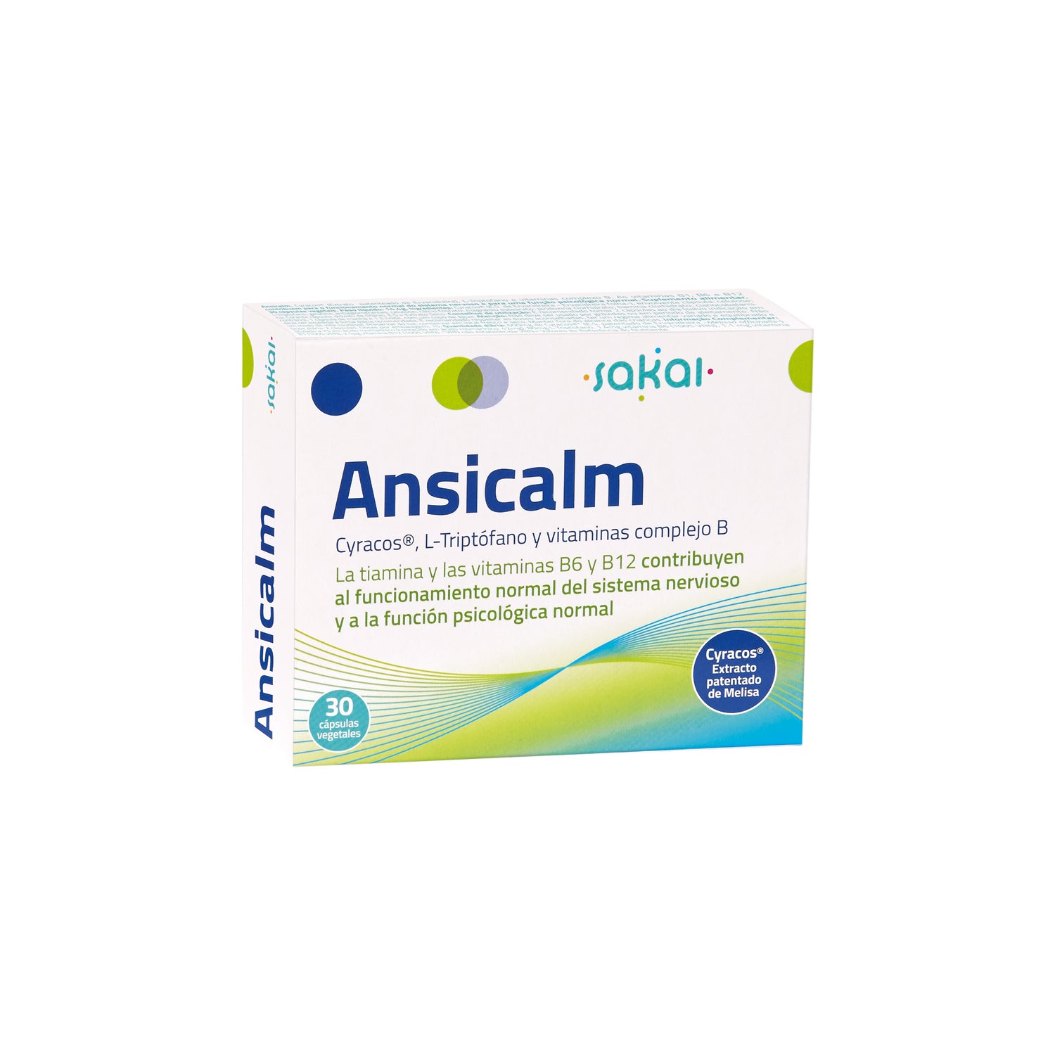 Sakai Ansicalm 30Cáps es un complemento alimenticio a base de cyracos®, L-Triptófano, vitaminas B1, B6 y B12 que contribuye a una función psicológica normal. Indicado para adultos que están pasando por un periodo nerviosos o de estrés, personas intranquilas o con angustia