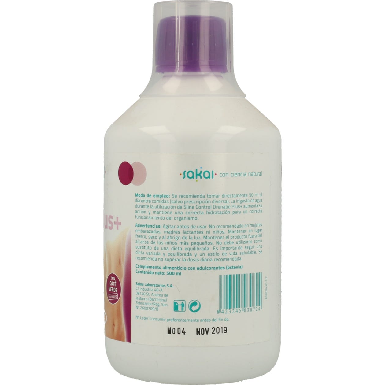 Sakai Sline Control Drenabe Plus + 500ml es un complemento alimenticio a base de L-carnitina, café verde, té verde, cola de caballo, abedul, vara de oro, ortosifón, diente de león y alcachofa. Ideal para drenar el exceso de líquidos acumulados.