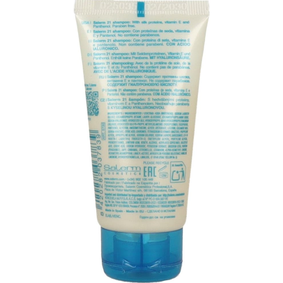 Salerm 21 Champú Silk Protein 50 ml para cabellos secos y dañados es un champú acondicionador que limpia con suavidad y ayuda a reparar en profundidad. Su fórmula con proteínas de seda actúa sobre la fibra capilar y aporta hidratación y nutrición desde la primera aplicación.