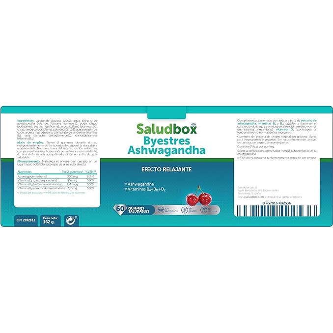 Complemento alimenticio en forma de gominolas a base de extracto de extracto de ashwagandha, vitamina D2, vitamina B6 y vitamina B12. Ayuda a regular el estado de ánimo y favorece la sensación de relajación mental. Además, sus ingredientes contribuyen a reducir los signos de fatiga y cansancio. Indicado para adultos.