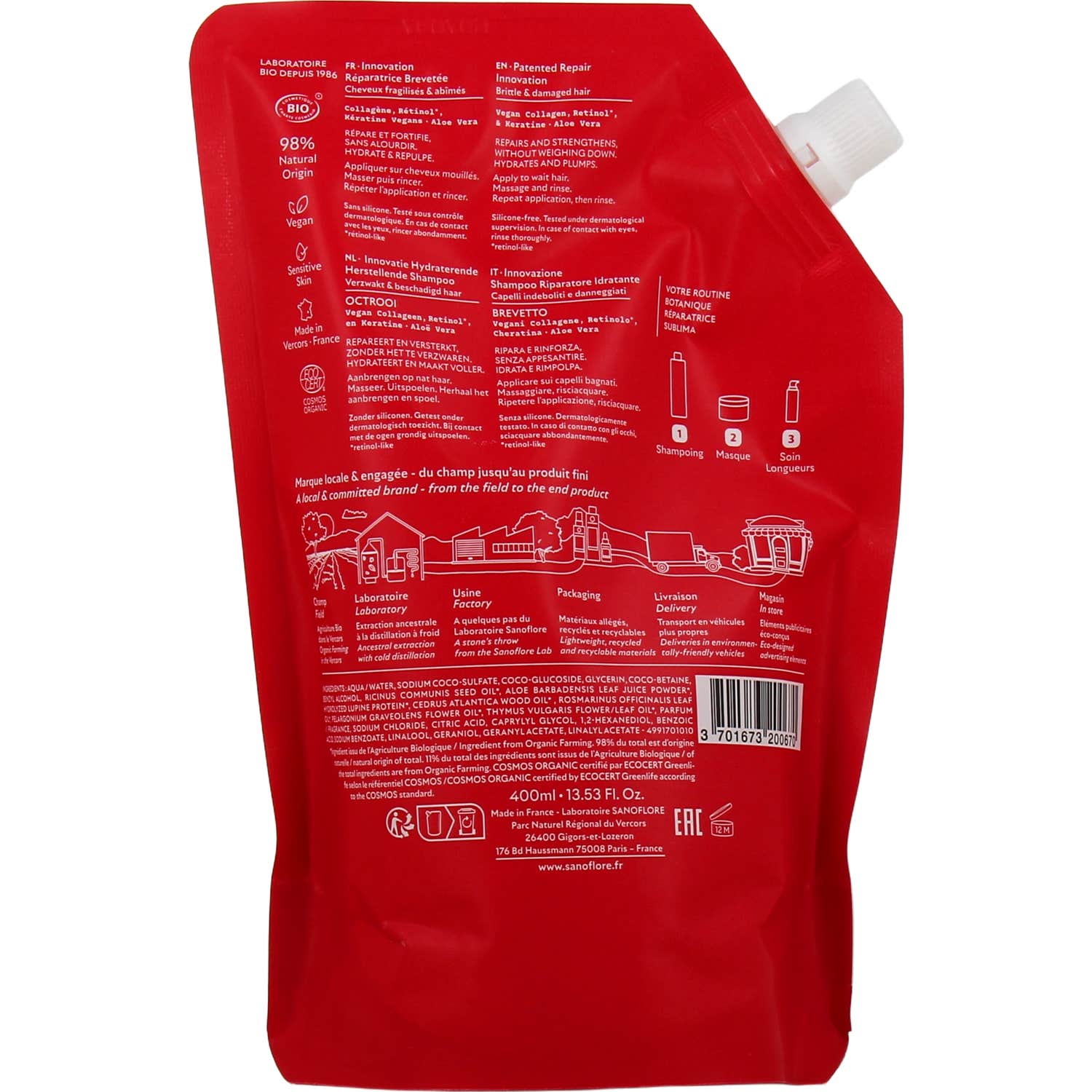 Sanoflore Sublima Champú Reparador Hidratante Recarga 400 ml es un producto diseñado para reparar y fortalecer el cabello dañado. Su innovadora fórmula incluye un complejo patentado que combina: