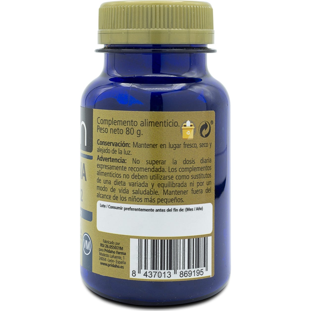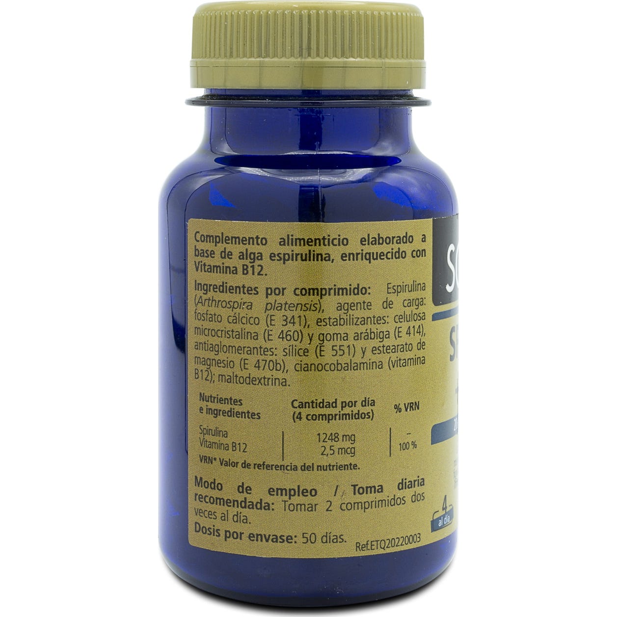 Alga Espirulina polvo (sulfitos) (Spirulina platensis, alga entera), agentes de carga (Celulosa, Fosfatos de Calcio, Monogliceridos de ácidos grasos y Dióxido de Silicio), Vitamina B12 (Cianocobalamina).