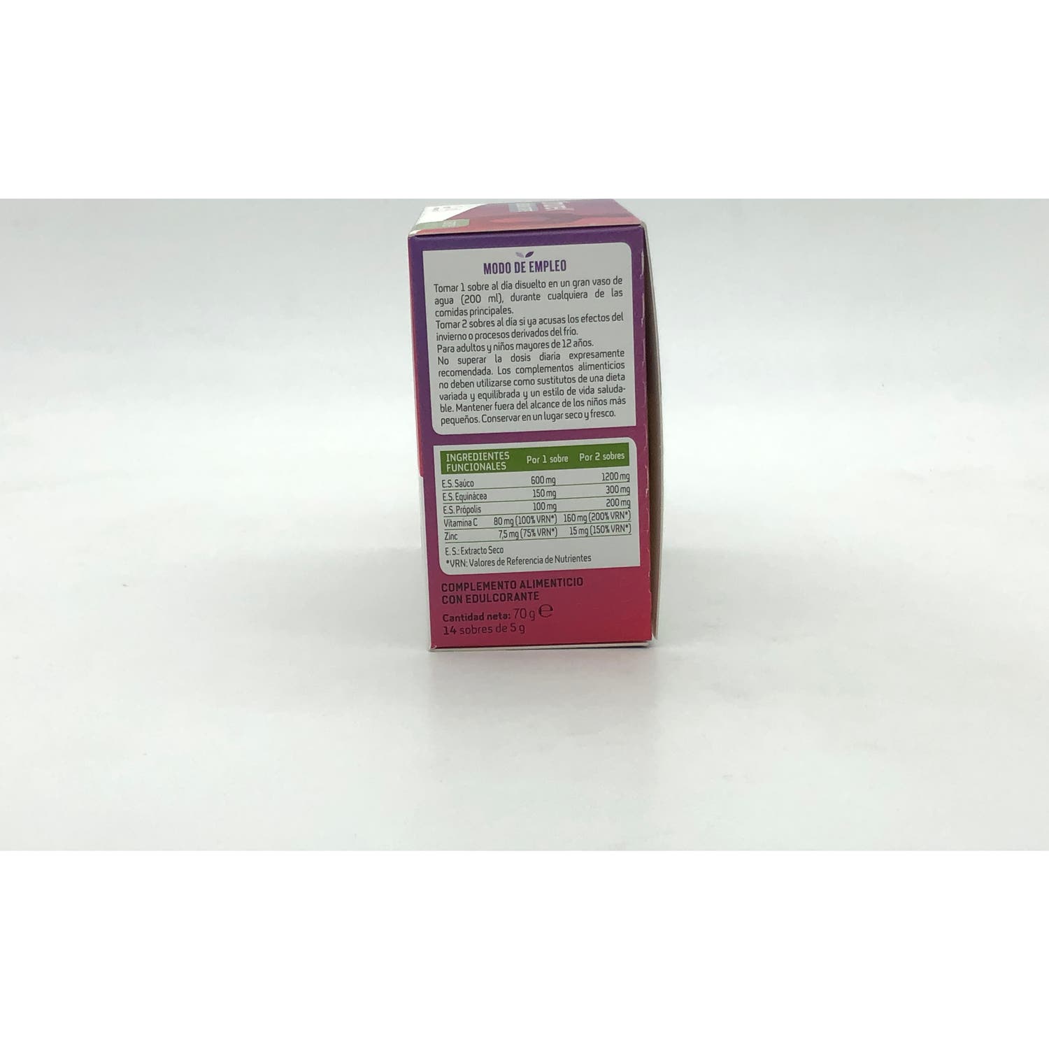 Complemento alimenticio en forma de sobres elaborado a base de equinácea, flor de saúco, propóleo, vitamina C y zinc que ayudan a reforzar el sistema inmunitario.
