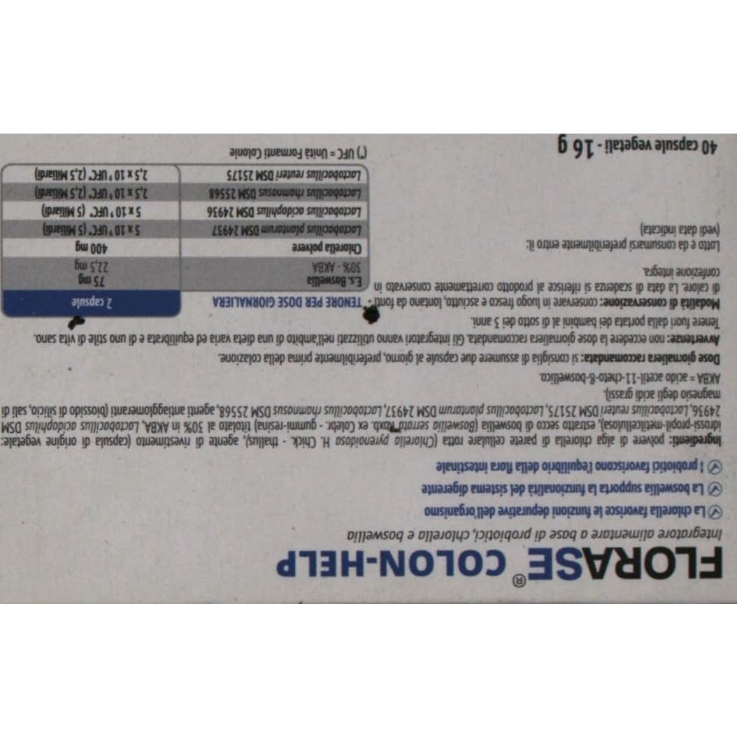 Alga chlorella en polvo de pared celular rota (Chlorella pyrenoidosa Chick.), gelatina vegetal, Boswellin® Super: extracto patentado de Boswellia (Boswellia serrata Roxb. – gomoresina) titulado al 50% en ácidos boswéllicos y 30% en AKBA, Lactobacillus acidophilus DSM 24936, Lactobacillus reuteri DSM 25175, Lactobacillus plantarum DSM 24937, Lactobacillus rhamnosus DSM 25568, antiaglomerantes (dióxido de silicio y estearato de magnesio). AKBA = ácido acetil-11-ceto-ß-boswéllico.