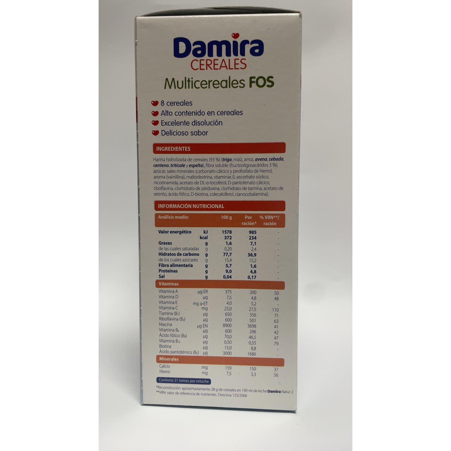 CEREALES HIDROLIZADOS SIN GLUTEN (91%) (TRIGO, ARROZ, MAÍZ, AVENA, CEBADA, CENTENO,SORGO Y MIJO), AZÚCAR, FRUCTOOLIGOSACÁRIDOS (3%), SALES MINERALES (FOSFATO CÁLCICO, HIERRO REDUCIDO),EXTRACTO DE MALTA, AROMA DE VAINILLA, VITAMINAS (L-ASCORBATO SÓDICO, NICOTINAMIDA, ACETATO DE DL- ALFA TOCOFEROL, D-PANTOTENATO CÁLCICO, RIBOFLAVINA, CLORHIDRATO DE PIRIDOXINA, CLORHIDRATO DE TIAMINA, ACETATO DE RETINILO, ÁCIDO FÓLICO, D-BIOTINA, COLECALCIFEROL, CIANOCOBALAMINA). CONTIENE GLUTEN.