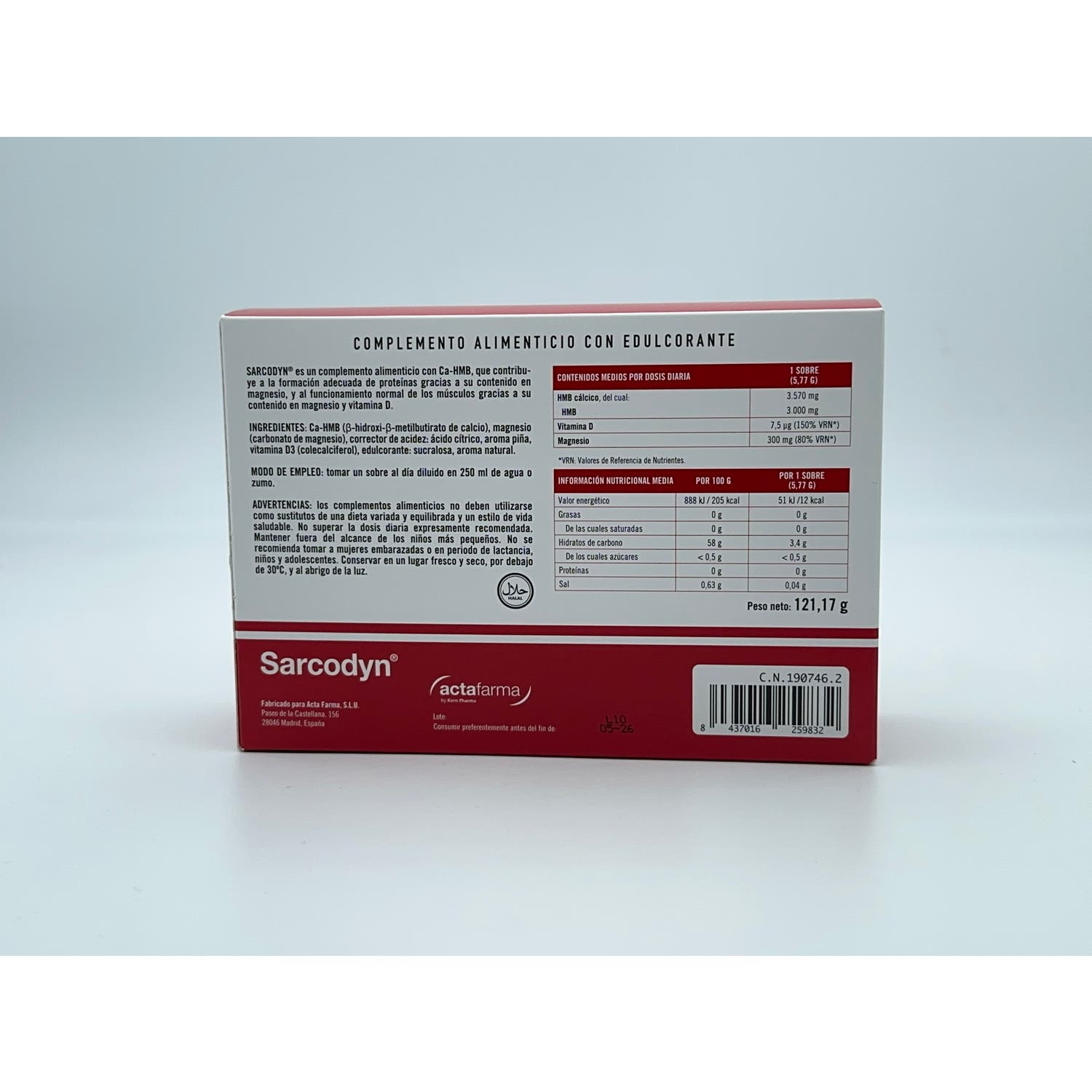 Además, su contenido en magnesio contribuye a la formación adecuada de proteínas. Sarcodyn está formulado a base de CaHMB, vitamina D, magnesio.