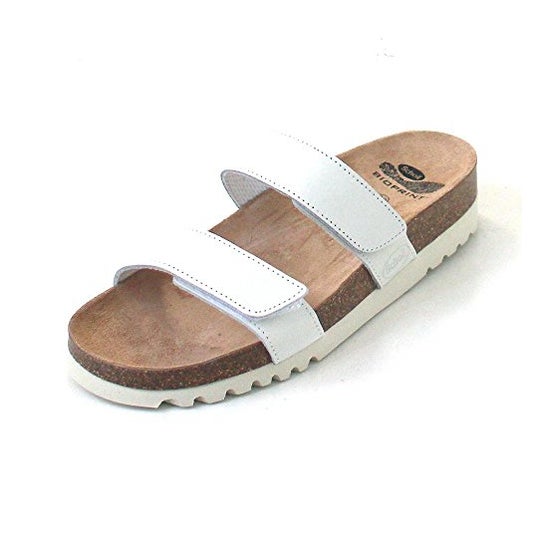 Es una sandalia con tecnología Scholl Bioprint®, caracterizada por una suela de corcho natural y goma diseñada ergonómicamente para mantener el pie en la posición correcta. Un modelo práctico y relajado, su cierre de velcro permite que el zapato se adapte perfectamente al pie. Talla: 40. Color: Blanco.