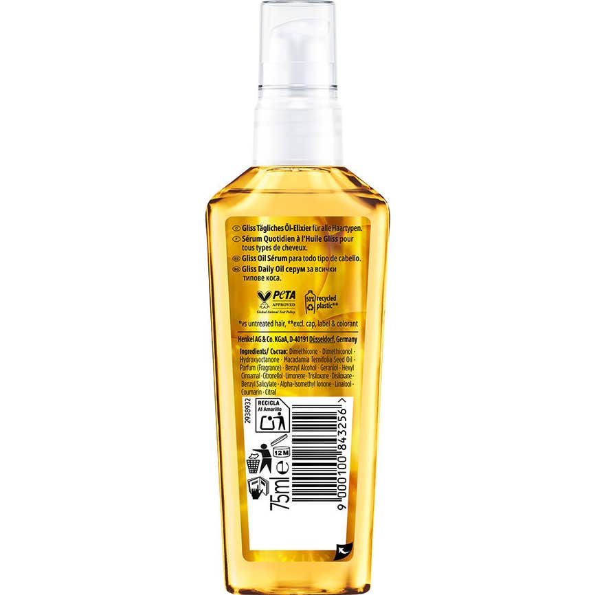 Schwarzkopf Gliss Daily Oil Sérum, con un formato de 75 ml, es un producto diseñado para el cuidado diario del cabello. Su fórmula ligera proporciona una nutrición eficaz sin dejar sensación de pesadez. Es apto para todo tipo de cabellos, destacándose por su contenido de Aceite de Argán, que otorga suavidad y luminosidad.