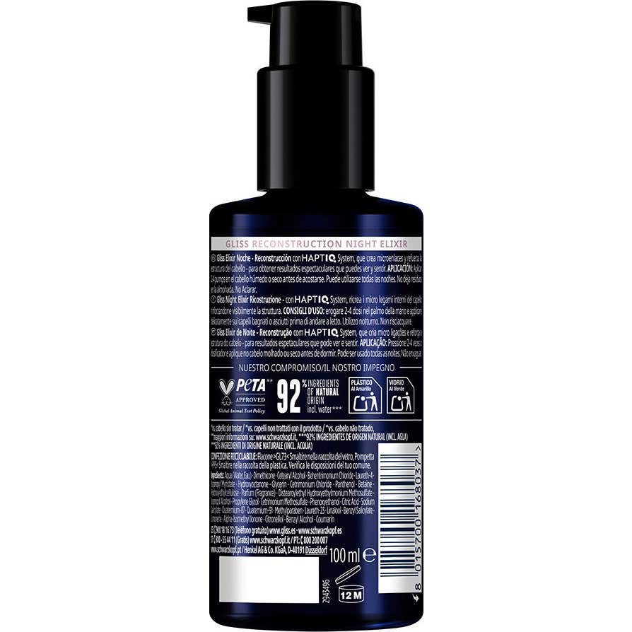 Schwarzkopf Gliss Night Elixir Reconstrucción Puntas Abiertas 100ml es un tratamiento diseñado específicamente para cabellos dañados y con puntas abiertas. Este elixir nocturno incorpora: