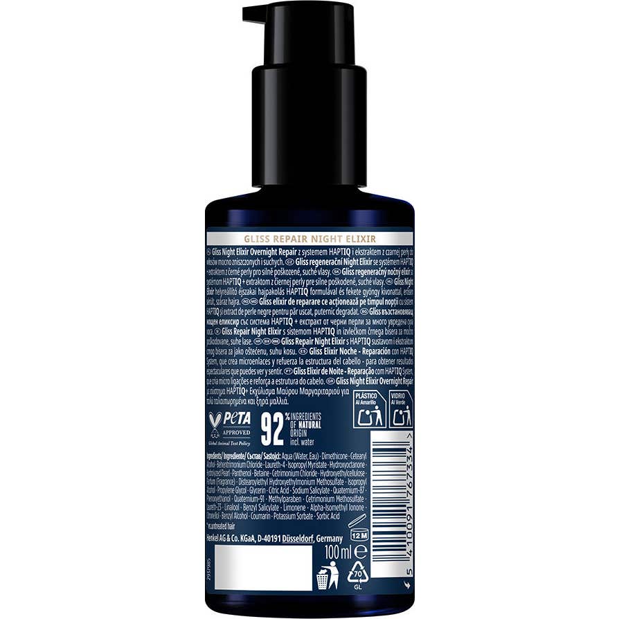 Schwarzkopf Gliss Night Elixir Sérum Cabello Dañado es un tratamiento específico diseñado para cabellos muy dañados y secos. Este sérum, que se presenta en un formato de 100 ml, incorpora Extracto de Perla Negra y el innovador HaptIQ System, que actúan en conjunto para crear microenlaces en la fibra capilar.