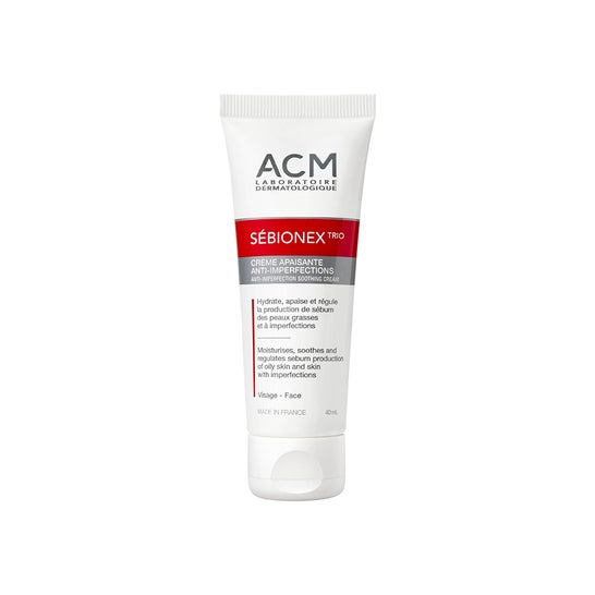Sebionex Trío Crema Calmante Anti-Imperfecciones 40ml es un tratamiento dermatológico de ACM para el cuidado diario de pieles mixtas, grasas y con tendencia a imperfecciones. Su fórmula avanzada regula el exceso de sebo, calma la piel y reduce visiblemente las imperfecciones, proporcionando un aspecto fresco y sin brillos.