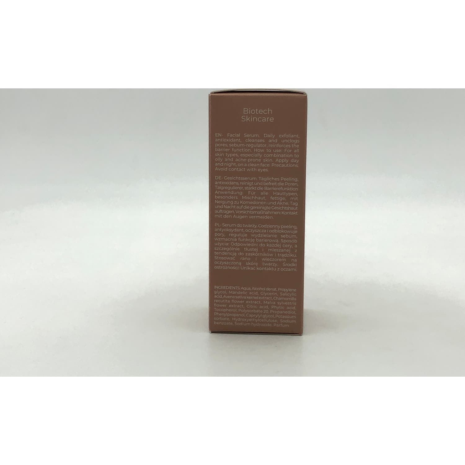 Suero renovador de la superficie cutánea desarrollado con 2% de ácido salicílico obtenido de la corteza del sauce. Ayuda a desobstruir los poros inflamados con una acción exfoliante, eliminando las células muertas acumuladas. Contiene ácidos mandélico, cítrico y fítico, que contribuyen a regular la producción de sebo en el rostro y a prevenir de las marcas del acné. Enriquecido con extractos de avena, manzanilla y malva, que aportan propiedades suavizantes, antisépticas, calmantes, emolientes y antioxidantes. Adecuado para pieles mixtas a grasas. Apto para veganos.