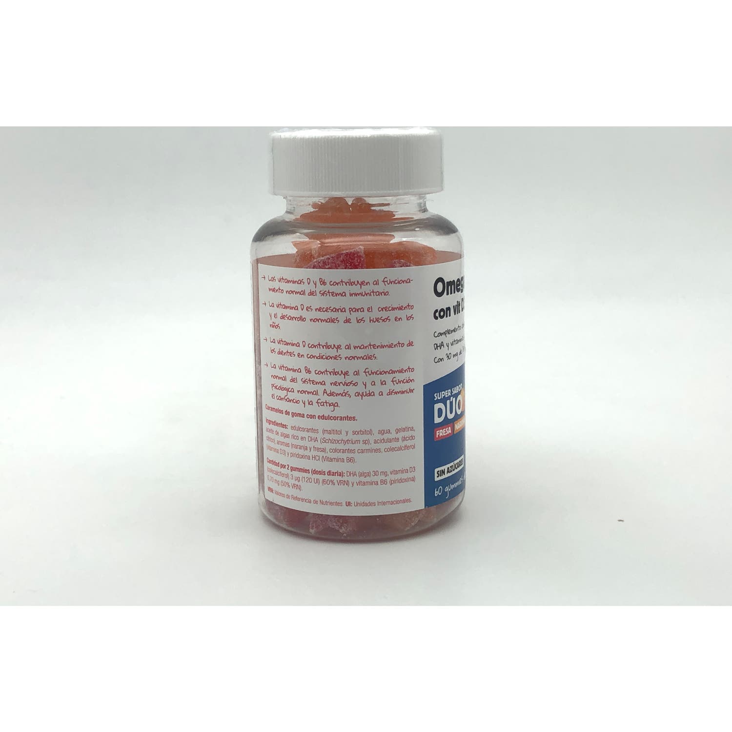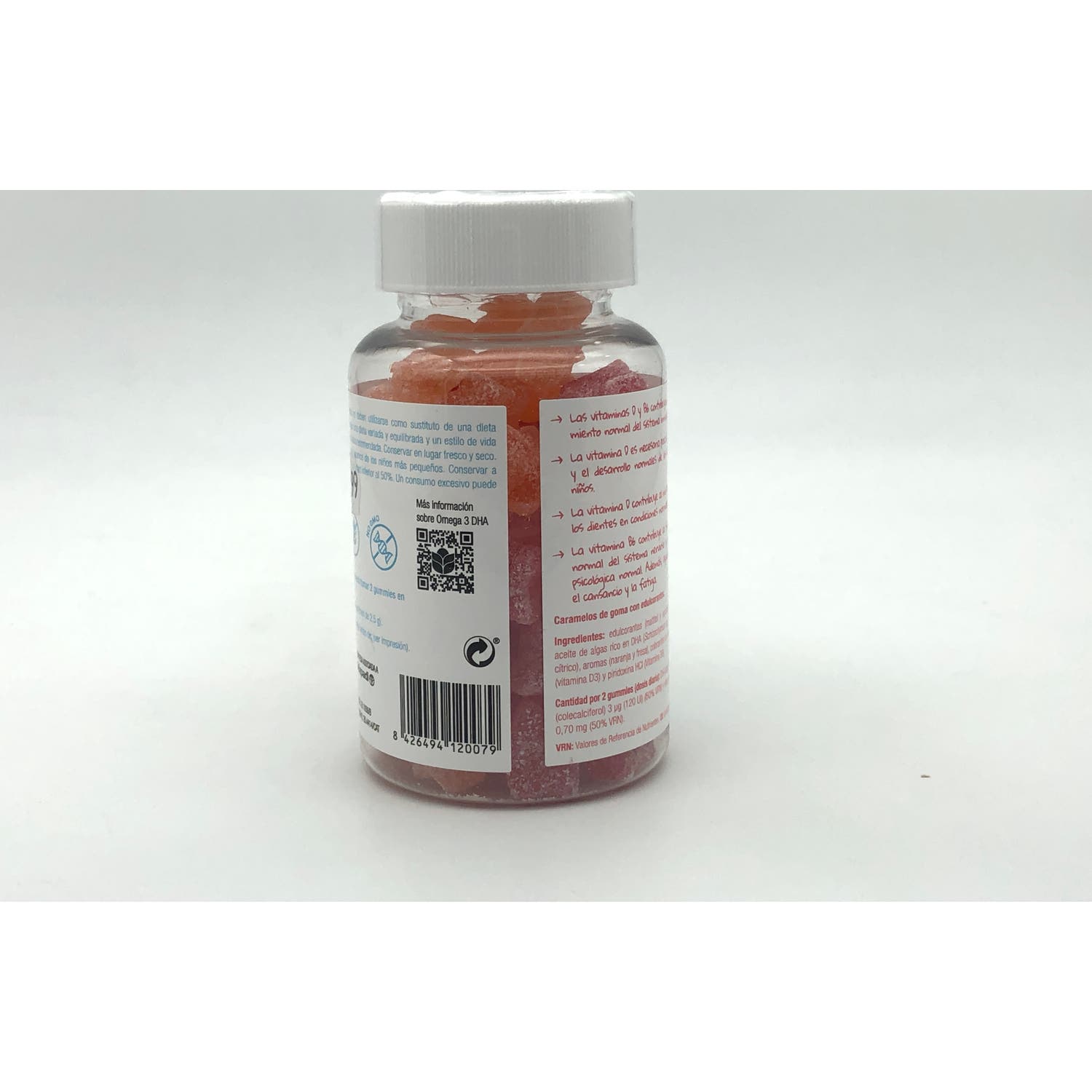 Complemento alimenticio especialmente desarrollado para la edad infantil, en forma de divertidas gominolas con sabores a fresa y naranja, elaborado a base de ácidos grasos omega 3 procedente de aceite de algas, muy rico en DHA.