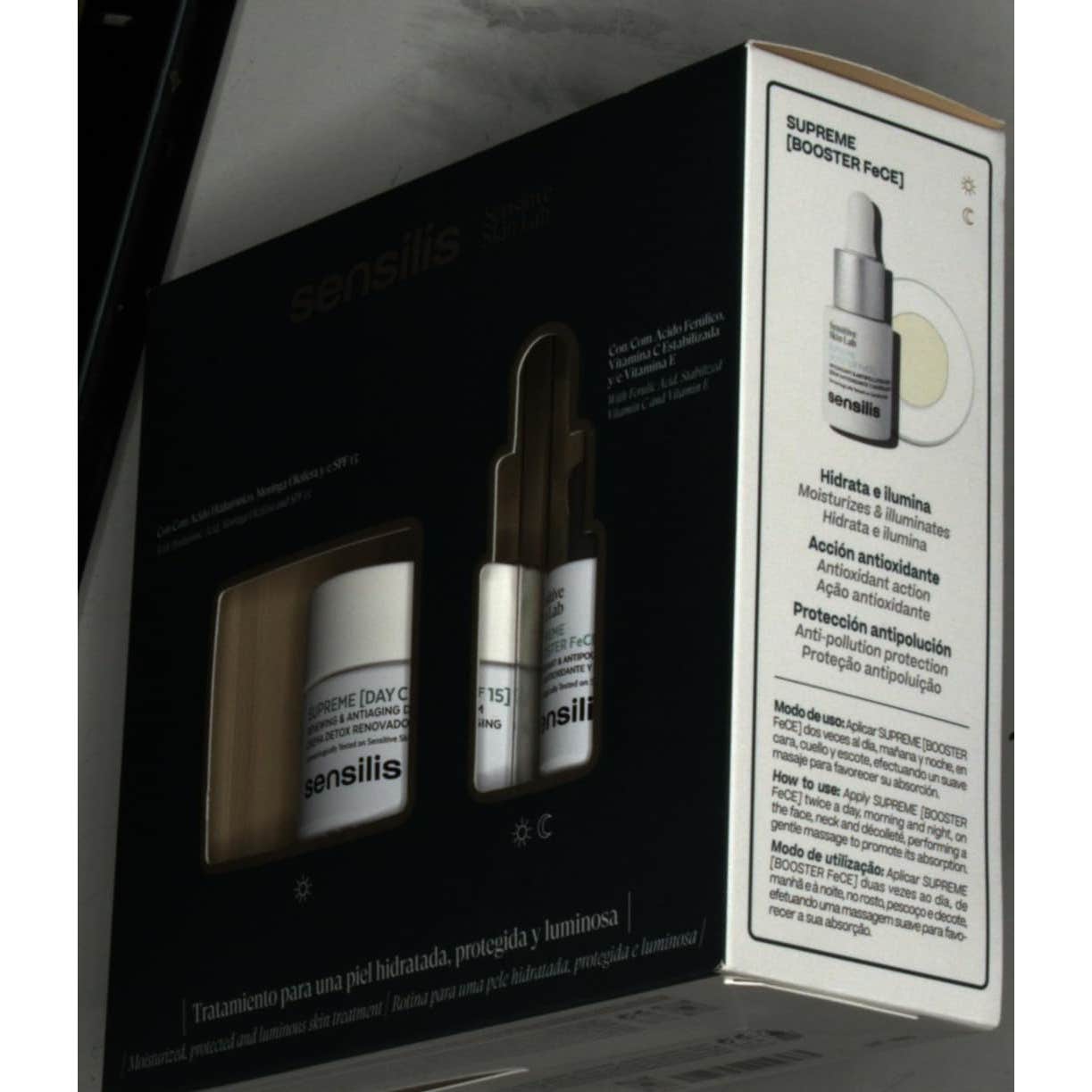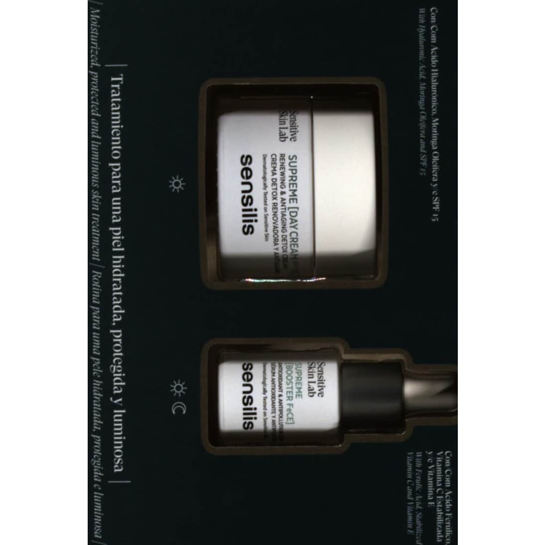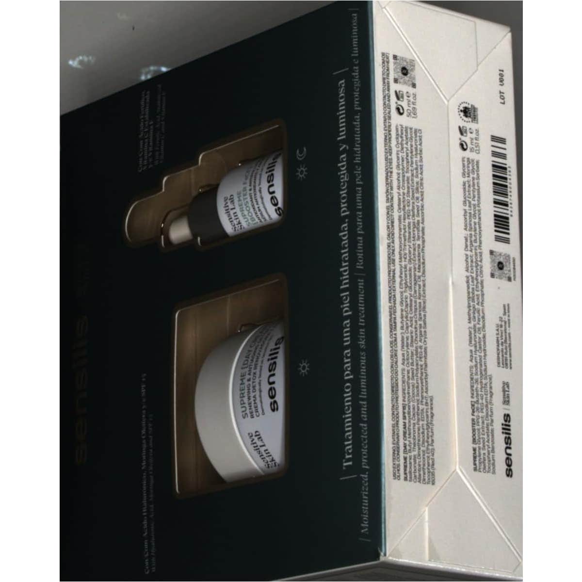 Sensilis Supreme Day Cream SPF15 50ml + Supreme Booster Serum 15ml es un pack de cuidado facial compuesto por una crema hidratante, antioxidante y protectora, y un sérum de textura ultraligera, con vitamina C y E y propiedades antioxidantes, antipolución e iluminadoras.