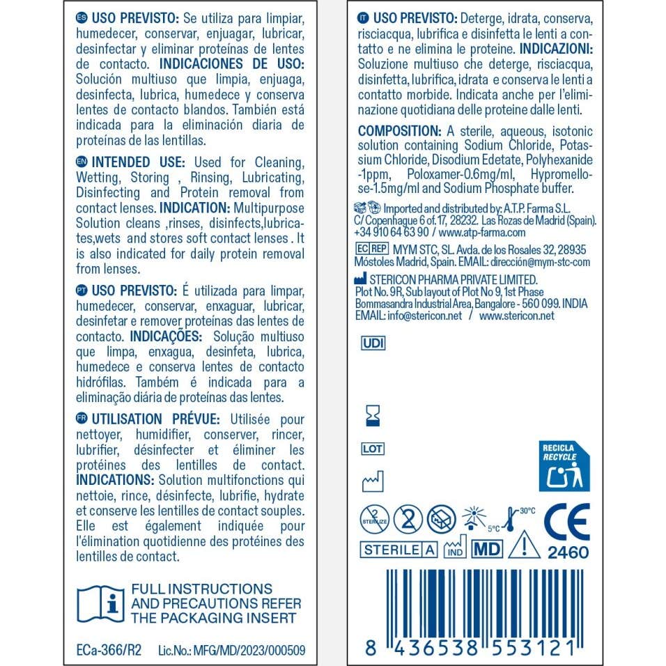 de solución · No utilice el producto después de la fecha de caducidad · Mantenga fuera del alcance de la luz sola · No utilice el producto si el paquete está dañado · No toque ninguna superficie con la punta del tapón, ya que podría contaminarse la solución · SÓLO PARA USO EXTERNO · Utilice siempre una solución nueva y nunca reutilice la solución que quede en el estuche de almacenamiento de lentes · Cambie la solución para lentes de contacto todos los días, incluso si no se pone las lentes a diario · Pueden producirse infecciones oculares si las lentes no se manipulan según las instrucciones de uso · Aplíquese, en su caso, maquillaje para los ojos solo después de ponerse las lentes para evitar que se manchen · No cambie la solución para el cuidado de las lentes de contacto sin consultar al oculista · Notificación de incidentes graves: En caso de incidentes graves relacionados con el uso del producto sanitario, se informará al fabricante o a la autoridad nacional competente, según la práctica nacional