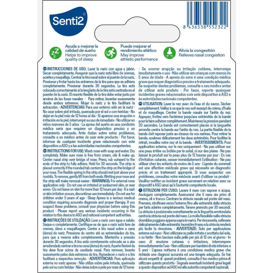 Para uso externo sólo en la nariz · No usar sobre piel irritada, quemada por el sol o con heridas · No dejar en la piel más de 12 horas al día · Si aparece una erupción o irritación en la piel, interrumpir su uso de inmediato · No utilizar en niños menores de 5 años · La apnea del sueño es una condición médica seria que requiere un diagnóstico preciso y un tratamiento adecuado. Ante dudas sobre estos problemas, consulte a su médico antes de usar este producto · Por favor, informar de cualquier incidente grave relacionado con este dispositivo a ASO y a las autoridades nacionales competentes.